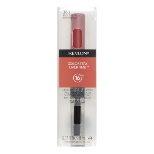Revlon Color Stay Overtime Lip color is a dual-ended long-wearing lipstick thats transfer-proof kiss-proof so you can forget touch-ups throughout your day or night. Get shiny lip color that doesnt smudge off or rub off and conditions with vitamin E. One end smoothes on our long-wearing Color Stay liquid lipstickweve made it an extra-plush so it feels soft on your lips and the other end is loaded with a clear lip gloss that acts as a topcoat for a slick look. The upgraded clear lip gloss contains ingredients including vitamin E for even more comfort plus moisture! chamomile and soy extract. Youll get color that never feels dry bleeds or feathers. Its available in 30 lipstick colors ranging from reds nudes browns pinks and plums.Specifications