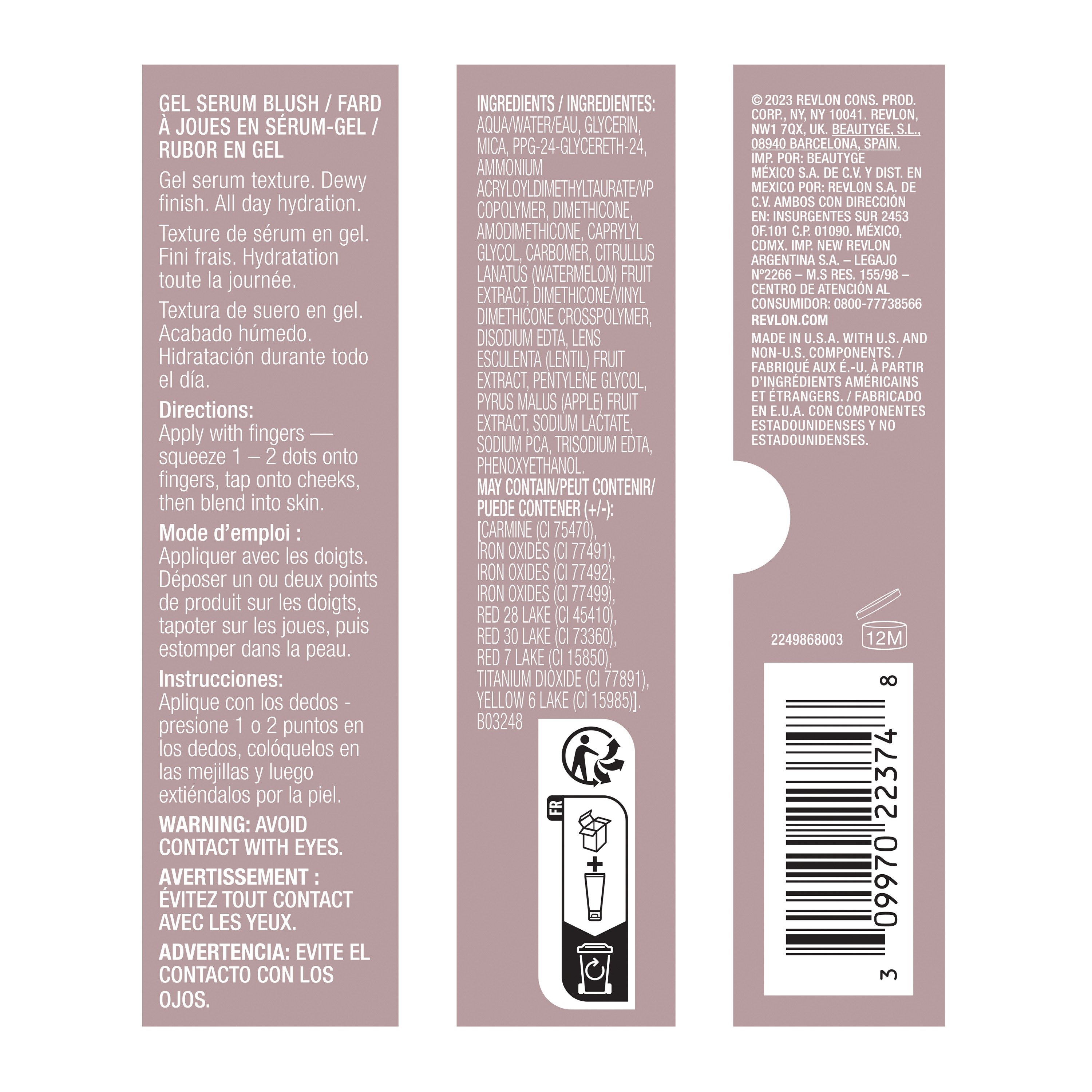Makeup that actually improves skin. Now blush goes beyond ordinary -- Revlon Illuminance Gel Serum Blush provides sheer color and visibly plumps cheeks with a healthy-looking glow. The lightweight formula with skin-caring Superfood Complex + Glycerin instantly hydrates and helps skin retain moisture. Glides on smoothly and blends evenly. Complements a variety of different skin tones.Specifications