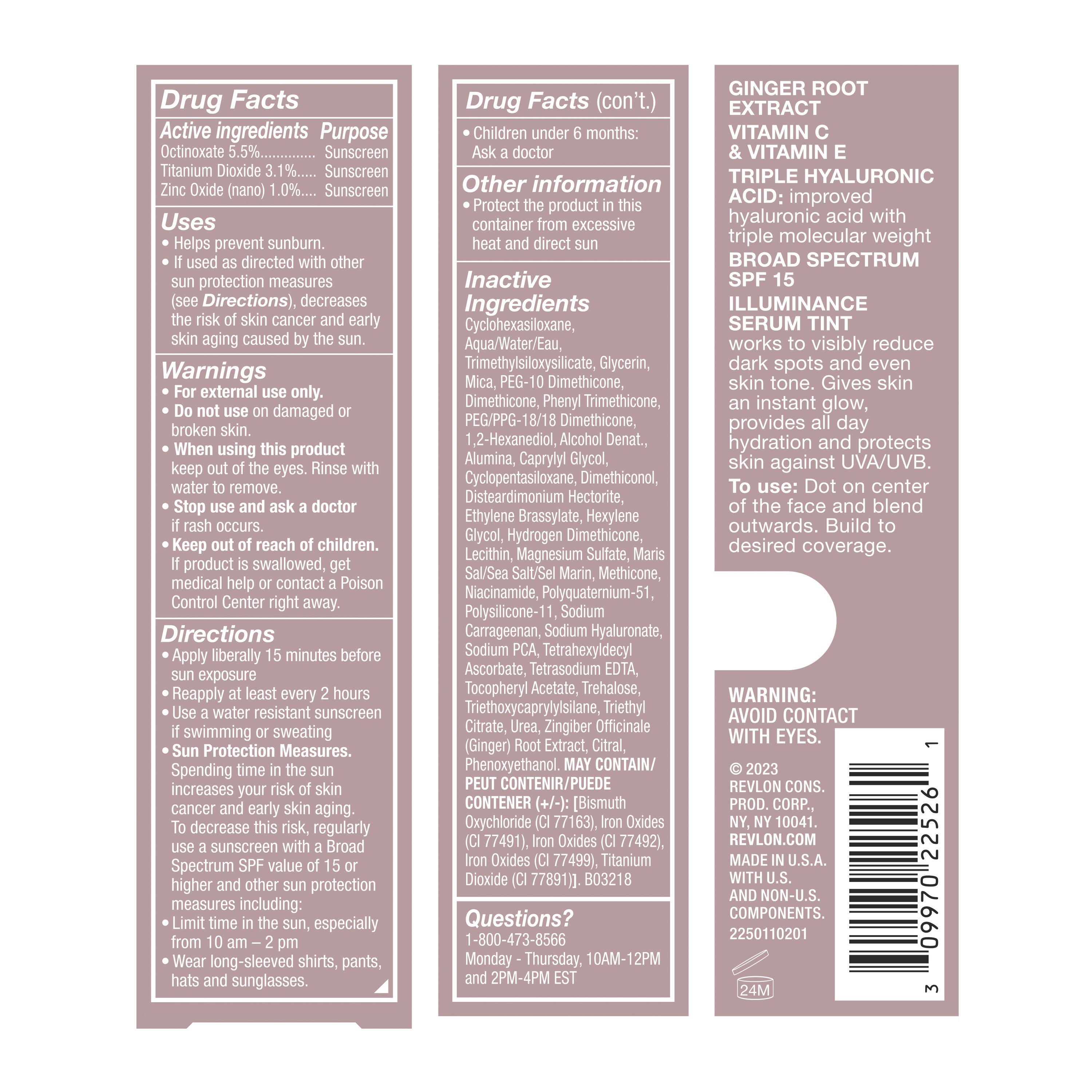 Makeup that actually improves your skin. Revlon Illuminance Serum Tint provides light, natural coverage that enhances your complexion instantly with a soft, satin finish. It’s both breathable and buildable, so you can control your level of preferred coverage. Formulated to boost your skin’s radiance, it evens skin tone and visibly reduces dark spots over time -- with results in 4 to 8 weeks. Infused with skincare ingredients like Ginger Root Extract + Vitamin C that work to even skin tone. It also contains Vitamin E + hydrating Hyaluronic Acid. SPF 15 protects and helps prevent the signs of aging. Available in 16 shades.Specifications