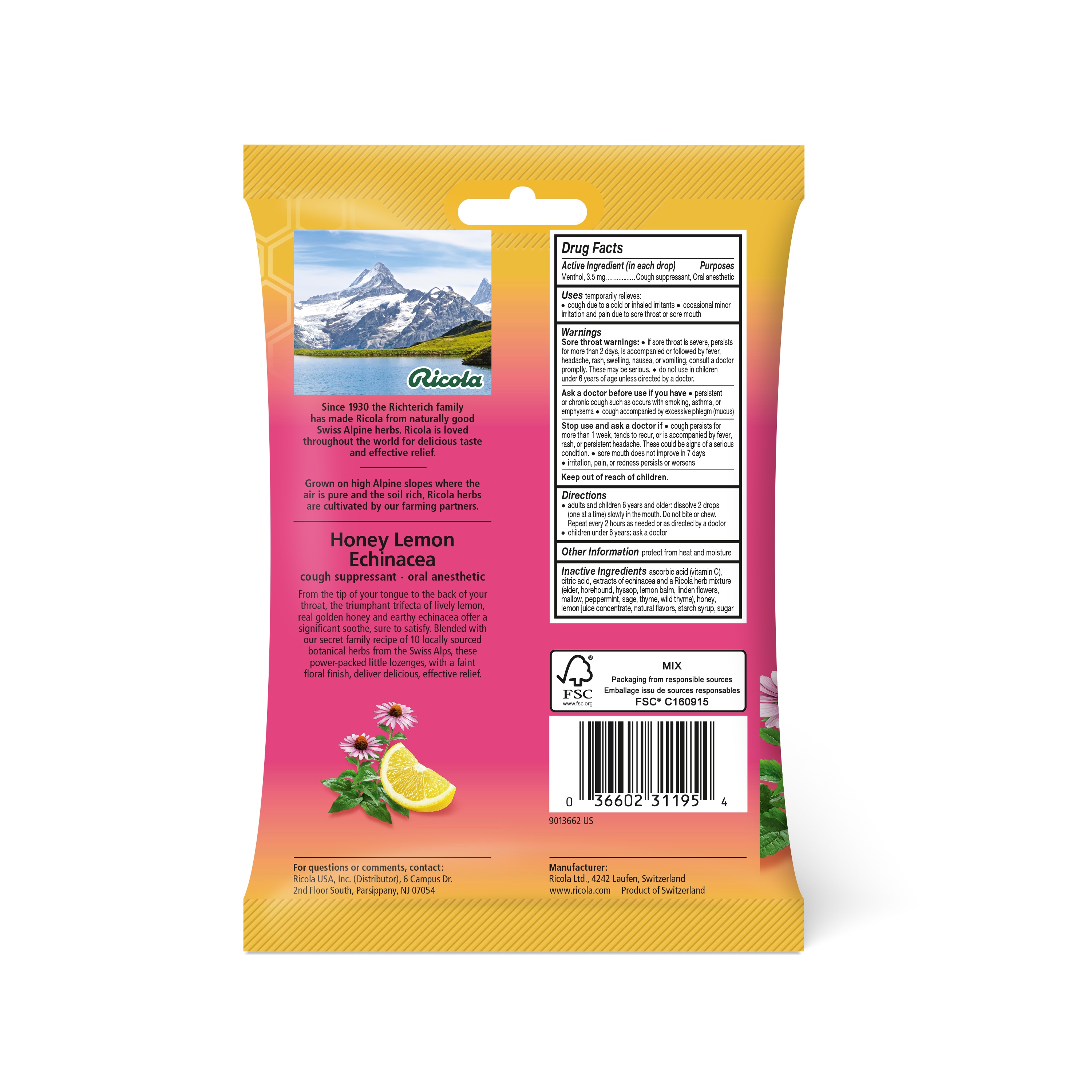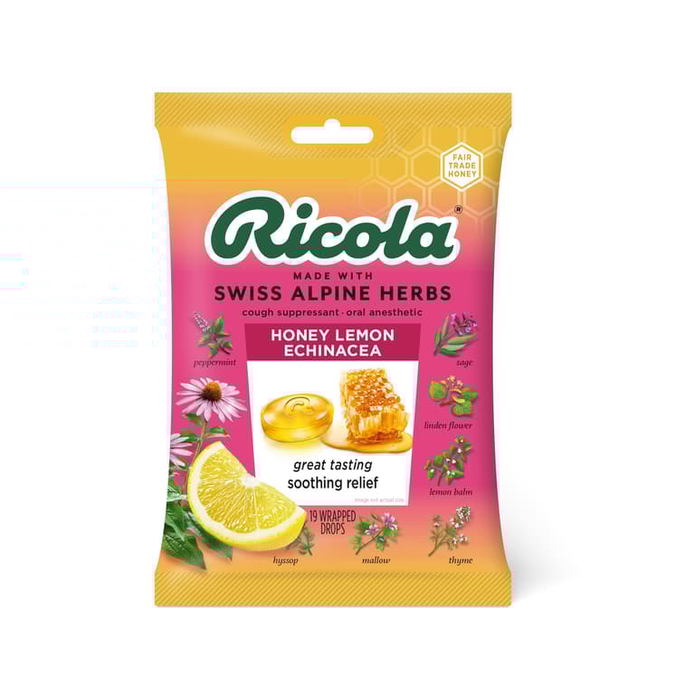 Ricola Honey Lemon W/Echinacea Cough Suppressant Throat Drops Natural Fights Coughs. Naturally Soothes Sore Throats. From Switzerland. Ricola Honey Lemon with Echinacea Cough Suppressant - Throat Drops. Enjoy the finest quality ingredients with cough drops made from high quality Swiss mountain herbs. Lozenges bring a unique, delicious taste and soothe the mouth and throat. A combination of honey, herbal lemon balm and Echinacea work in harmony to bring soothing relief to sore throats. Lozenges are ideal for use as cough suppressants and oral pain relievers, battling the uncomfortable symptoms of cough due to a cold or inhaled irritants, as well as minor irritation and pain due to sore throat or sore mouth.Specifications