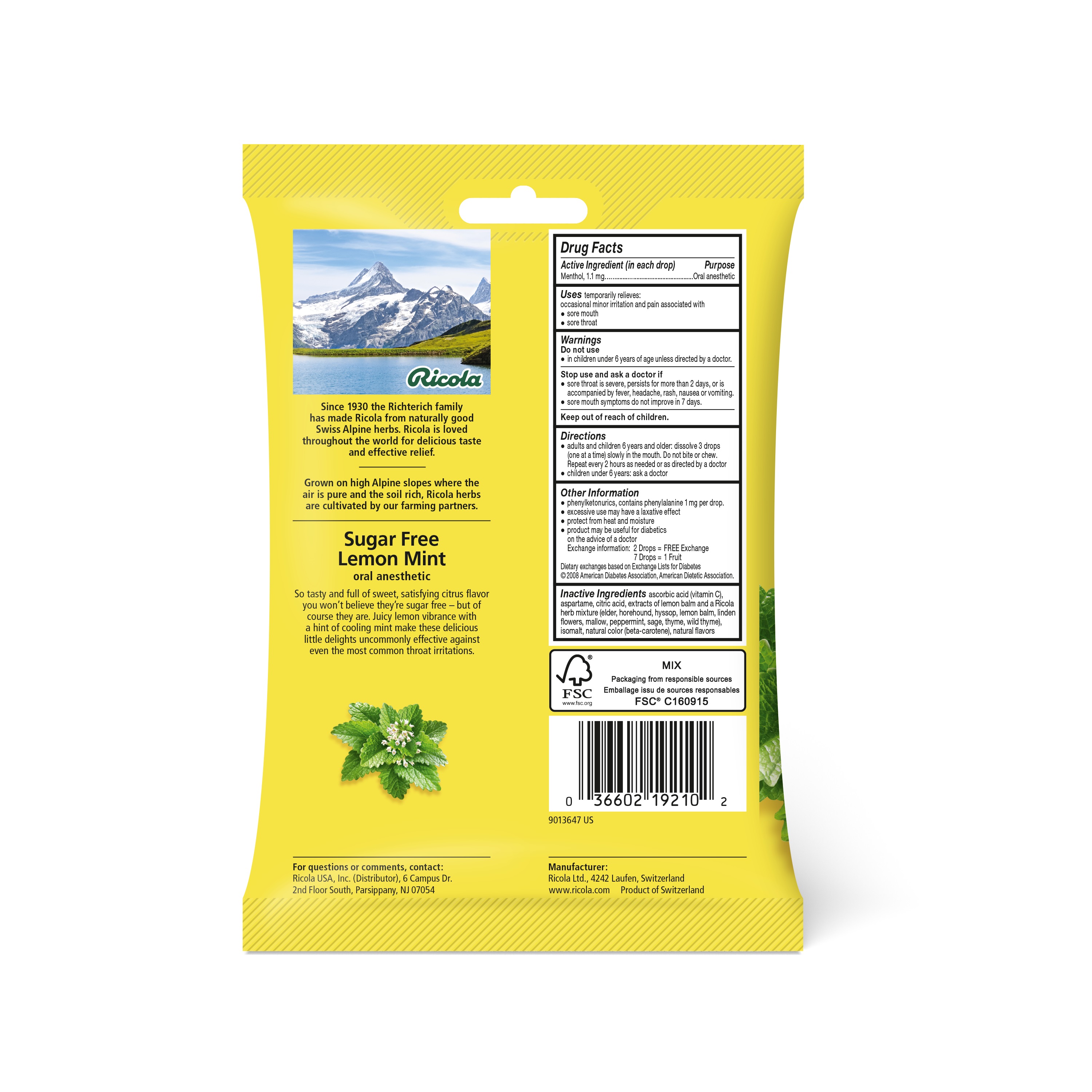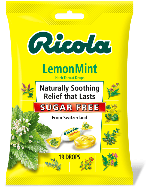 RICOLA SUGAR-FREE LEMON MINT THROAT DROPS: Ricola Lemon Mint Throat Drops combine refreshing lemon and mint with soothing menthol, flavored by Ricola's delicious blend of Swiss alpine herbs. A sugar-free lozenge that is soothing, effective, & pleasant. Active Ingredient (in each drop): Menthol, 1.5 mg (Also available with sugar in our variety pack.)SWISS HERBAL BLEND: Ricola's unique formula uses a secret blend of ten herbs grown in the Swiss mountains with natural farming guidelines. Our cough drops & sore throat lozenges offer the soothing relief of menthol with pleasantly herbal ingredients.RICOLA THROAT DROPS: Our throat lozenges have been trusted for coughs and sore throats from colds for over 80 years. Ricola is the original choice for relief, with soothing, calming menthol and the delicious flavor of our Swiss mountain herbal blend.HERBAL COUGH DROPS: Ricola has been trusted for cough & sore throat relief for generations. The soothing properties of Ricola's cough drops bring together the taste of Swiss Alpine farmed herbs like peppermint, thyme & lemon balm in these tasty drops.QUALITY & SUSTAINABILITY: The top priorities at Ricola are to ensure our raw materials are the highest quality and to maintain the exceptional standards when producing our various herb specialties. This is why our herbs are cultivated using natural methods in the Swiss mountains. Ricola embraces a sustainable approach when it comes to our thoughts and actions; our sustainability strategy rests on strong foundations, as reflected in our corporate motto, 'Sustainability is our way of life'Specifications