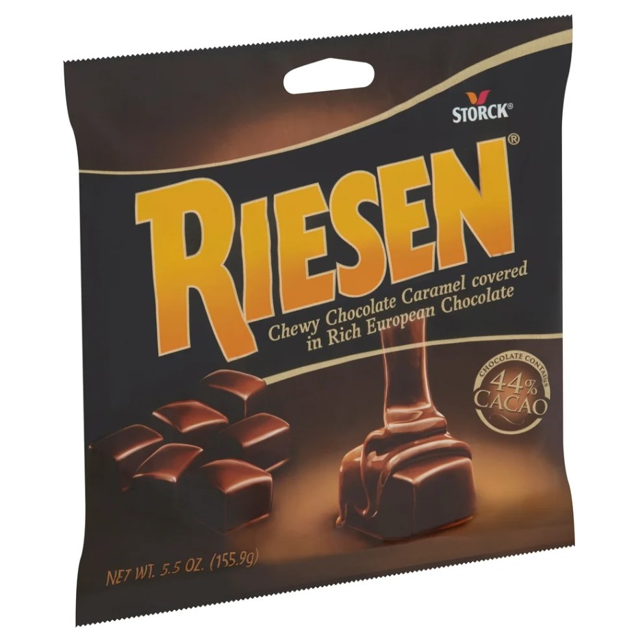 RIESEN CHOCOLATE COVERED CARAMEL IS A PREMIUM GERMAN CONFECTION FIT FOR ROYALTY WITH ITS 44% CACAO AND LONG LASTING CHOCOLATE CARAMEL CENTER THAT IS ENROBED IN SMOOTH DARK CHOCOLATE.Specifications