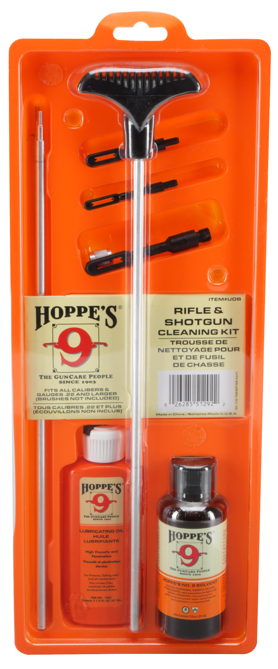 The Rifle/Shotgun cleaning kit includes No.9 solvent, lubricating oil, patches, rifle rod with rifle and shotgun adapter and slotted ends for rifles and shotguns. This cleaning kit comes in a clamshell package.