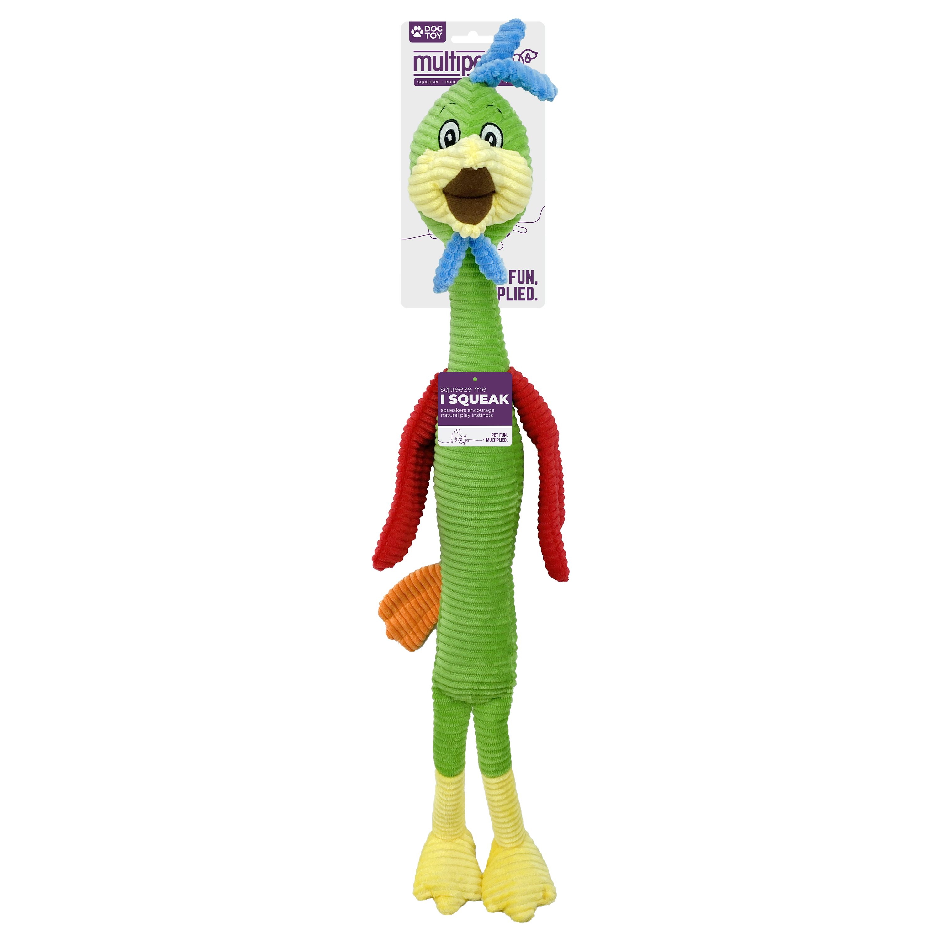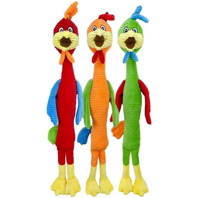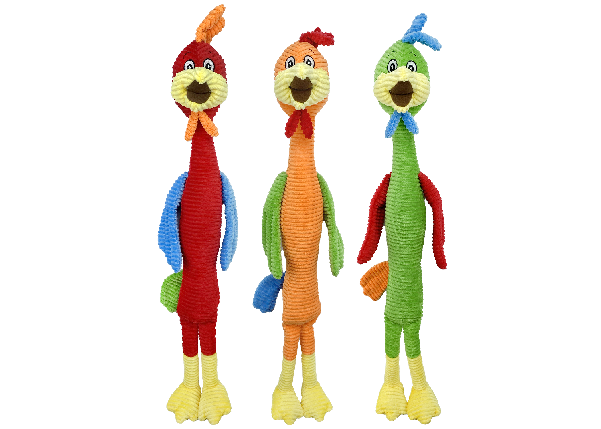 Corduroy fabric, Includes crinkle and squeaker; Cute, brightly colored rooster; Long body, perfect for tug of war