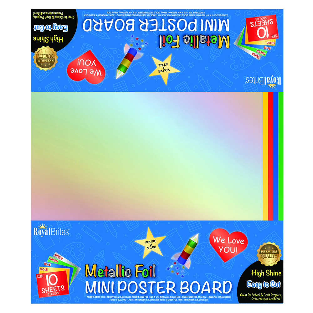 Make your projects shine with Royal Brites Multi-Color Metallic 12x14 Inch Poster Board 10-Pack perfect for creating bold, attention-grabbing projects that dazzle! Each board features a brilliant metallic finish in a variety of vibrant colors that reflect light and add a sleek, modern look to school projects, crafts, party decor, signage, and more. The 12x14 inch size offers the ideal balance between space and manageability, giving you plenty of room to get creative without overwhelming your workspace. Whether you're designing a presentation board, making event or holiday decorations, or crafting one-of-a-kind artwork, the smooth, reflective surface enhances every detail. This 10-pack includes an exciting mix of metallic hues to inspire your creativity, making it a must-have for classrooms, crafters, students, and DIY enthusiasts. Lightweight and easy to cut, glue, and shape, these boards are both fun to work with and visually stunning. Add a high-impact shine to your next creation with metallic poster boards that stand out from every angle bold, bright, and built to impress!Specifications