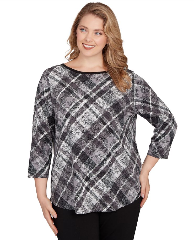3/4 SLEEVES; KNIT TOP; OVERLAY BIAS PLAID PRINT; SCOOP NECKLINE