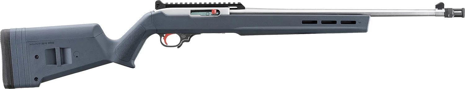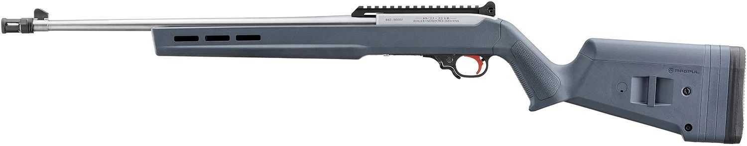 In celebration of the 60th Anniversary of the timeless 10/22 rimfire carbine, Sturm, Ruger & Co., Inc. is proud to introduce the Sixth Edition of the Ruger Collector's Series - the 60th Anniversary 10/22 Carbine. This rifle features a stainless steel barrel and silver-finished receiver paired with a Gray Magpul Hunter X-22 stock. The blackened bolt is laser engraved with a unique 60th Anniversary marking. The rifle is accented with a red bolt handle and trigger and utilizes popular 10/22 features like a non-glare blade front sight, ghost ring adjustable rear aperture sight, extended magazine release, and a Picatinny rail. The 60th Anniversary 10/22 ships in a Collector's Series box with a Sixth Edition Ruger Collector's Series metal street sign and pin. IF "OUT OF STOCK" IS DISPLAYED: Please contact your local Bi-Mart for possible store transfer/special order options.Specifications