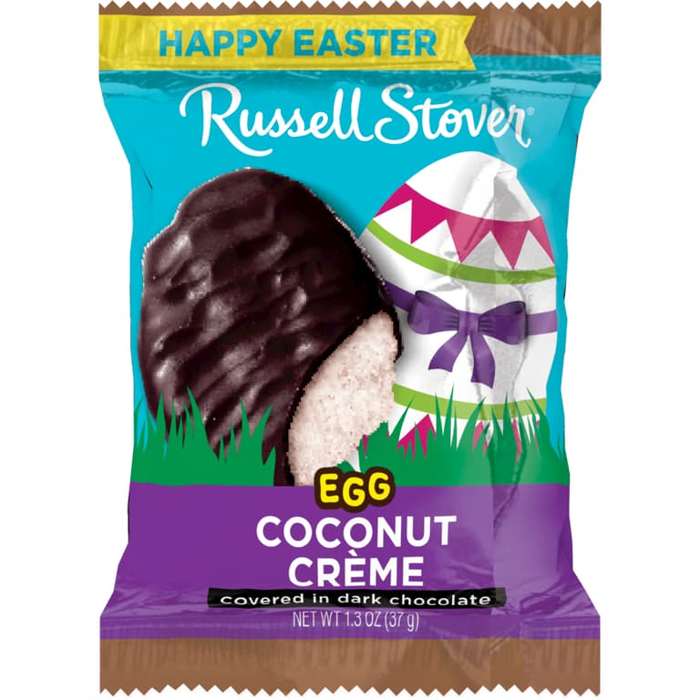 RUSSELL STOVER Easter Coconut Creme Dark Chocolate Easter Egg, 1.3 oz., combines two favorites into one deliciously sweet treat: soft coconut creme surrounded by our premium dark chocolate.This charming Easter candy egg is a perfect sweet treat or Easter basket filler.Specifications