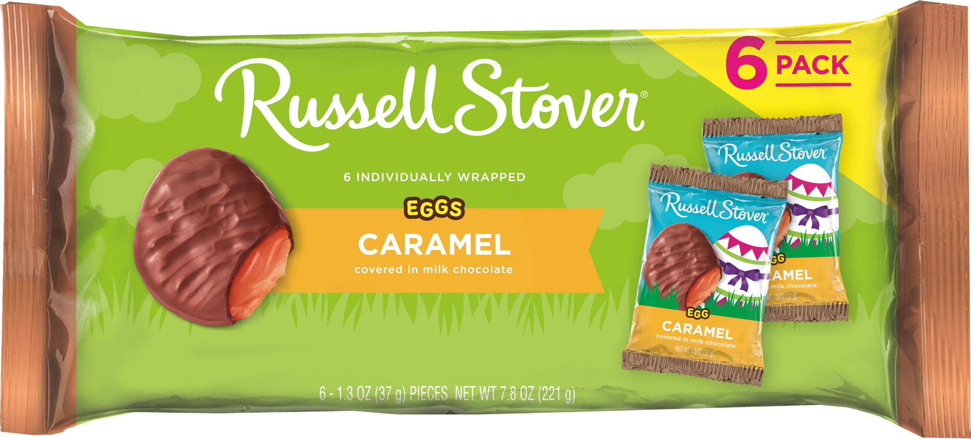 6 ct; 7.8 oz; Contains Milk, Soy; Enjoy a delicious caramel enrobed with Russell Stover milk chocolate; Includes 6 Caramel Eggs Covered In Milk Chocolate; Individually wrapped eggs; May Contain Peanuts, Tree Nuts, Eggs, Wheat; Perefect for sharing, Easter baskets, and display dishes.