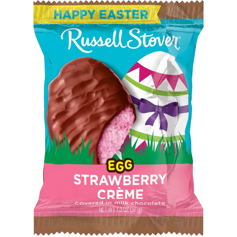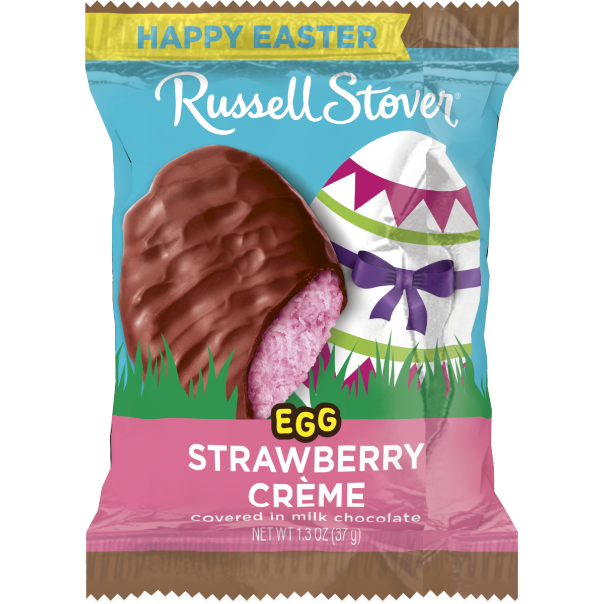 Contains Milk, Soy, Egg; Each 1.3 oz. egg features a sweet and fluffy strawberry creme center surrounded by our delicious milk chocolate; Individually wrapped, this charming Easter candy egg is a perfect sweet treat or Easter basket filler; May Contain Peanuts, Tree Nuts, Wheat; Milk Chocolate covered Strawberry Creme bar; RUSSELL STOVER Easter Strawberry Creme Milk Chocolate Easter Egg, 1.3 oz