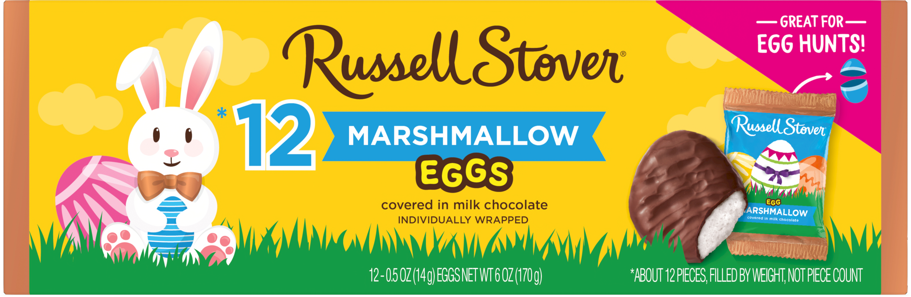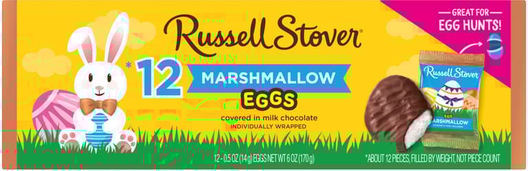 Get ready for Easter with Russell Stover Easter Marshmallow Egg Crate! This delightful treat features a crate filled with 12 individually wrapped marshmallow eggs covered in smooth and creamy milk chocolate. Made with high-quality ingredients, each egg provides a fluffy and sweet marshmallow center that's perfect for satisfying your sweet tooth cravings. With their festive packaging and convenient size, they're great for adding to Easter baskets or as a playful touch to your holiday celebrations. Treat yourself or a loved one to the indulgent taste of Russell Stover Easter Marshmallow Egg Crate this holiday season!Specifications