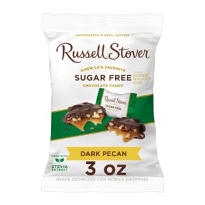 3 OZ; Contains Peanuts, Tree Nuts, Eggs, Wheat; he combination of crunchy pecans, chewy caramel, covered in fine chocolate candy is made with stevia extract, delivering the taste and tradition you remember, without the sugar.; Individually wrapped; Made with stevia extract; Russell Stover Sugar Free Dark Chocolate Pecan Delights; Sugar Free; sugar free chocolate candies, you can indulge in the delicious and delightful chocolate that you know and love, without the sugar.