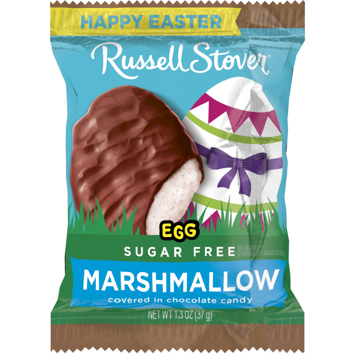 Contains Milk, Soy; Each 1.3 oz. egg combines fluffy marshmallow and covered in our creamy milk chocolate.; Individually wrapped, this charming Easter candy egg is a perfect sweet treat or Easter basket filler.; May contain peanuts, tree nuts, eggs and wheat.; RUSSELL STOVER Easter Sugar Free Marshmallow Milk Chocolate Easter Egg, 1.3 oz; SF Milk Chocolate covered Marshmallow bar