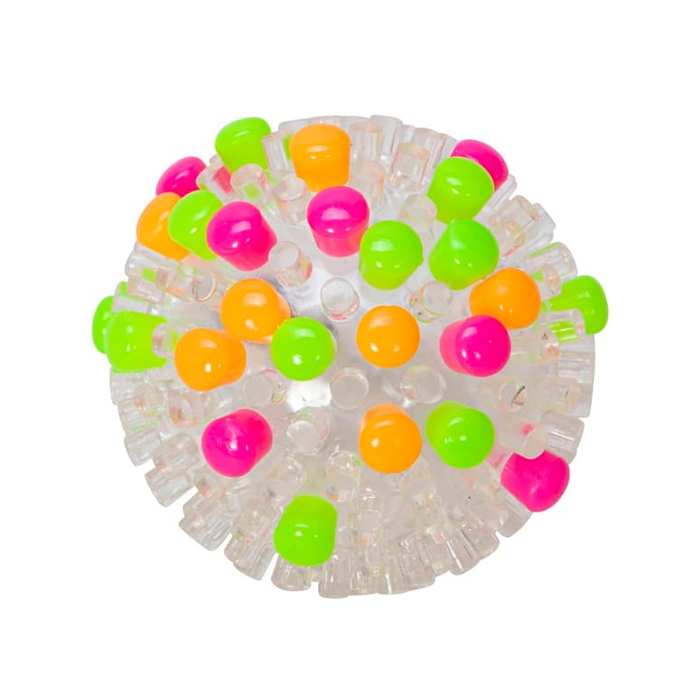 This ball glows in the dark. It comes with 225 glow in dark caps that snap onto the outside of the ball. Bouncing the ball activates the neon lights causing the lights to flash creating a bouncing light.Specifications