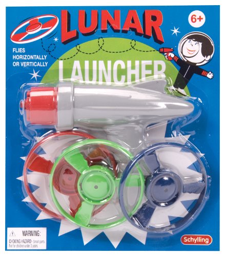 Take flight to the cosmos with the Lunar Launcher from Schylling Toys, the world leader in traditional toys and classic fun. Take one of the brightly colored lunar flight discs and twist it onto the space age styled launcher. Wind it up, pull the trigger and the disk flies off and can go 65 feet. Horizontally or vertically, it will fly in any direction you aim. The Lunar Launcher comes with 3 brightly colored plastic spinning disks and the trigger-activated, space age launcher. For ages 6 and above.Specifications