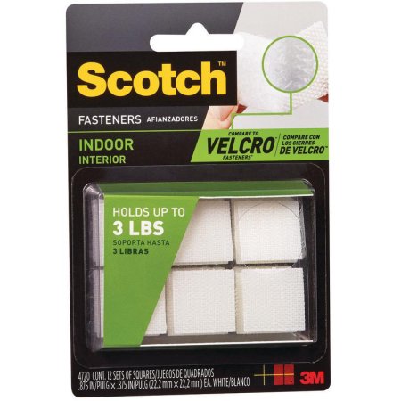 Lasts for thousands of closuresQuick and easy to useHolds up to 3 lbsWhite7/8" x 7/8"12 countScotch Indoor Fasteners are the alternative closure to zippers, snaps and hooks. Provides a convenient way to mount objects in the home, office or car. Try mounting a flashlight or remote controls to a wall, furniture or electronic devices. Great for under-cabinet lighting. Works on most surfaces that are painted, varnished or sealed surfaces, including drywall, wood, metal or brick.Specifications