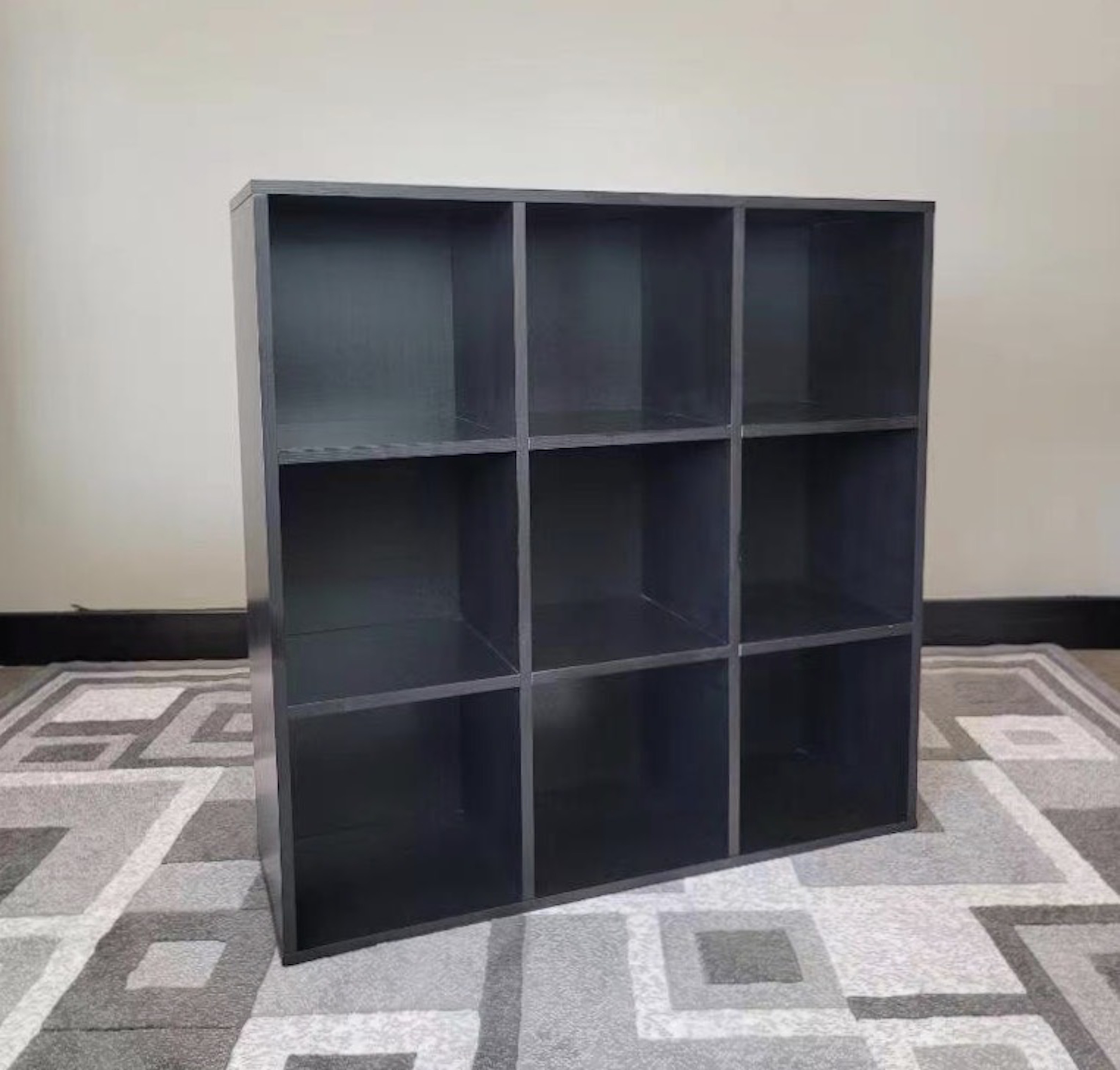 15mm Manufactured wood w Paper Veneer in Ebony Finish; 9 Bin 3x3 storage organizer cabinets; Holds up to 11" x 11" x 11" cube style storage bins; No tools assembly, Overall Size 35.9"W x 11.6"D x 35."H