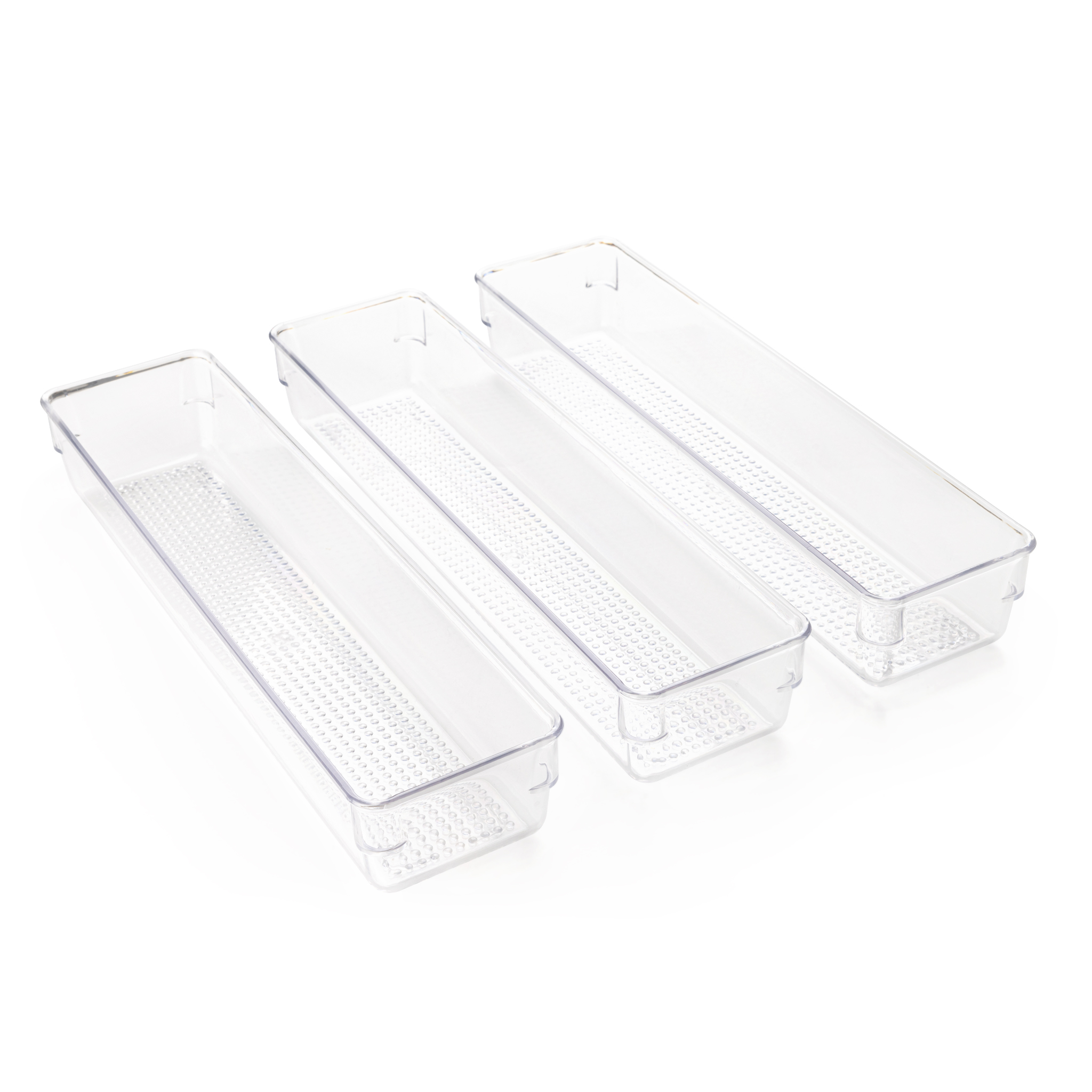 Organize your drawers to fit your needs. The clear design ensures visibility, and rounded corners facilitate easy cleaning.Package Includes 3-Pack Drawer Organizer Fits most standard-size drawers; measure shelf dimensions for proper fit. Great for organizing in the kitchen, bathroom, and more. Features and Benefits This drawer organizer set is a versatile and practical solution for keeping your spaces tidy. These organizers are not only designed to fit most standard-size drawers, but they are also nestable for easy storage when not in use. Product Specifications Dimensions: 3.2 (W) x 12.75 (D) x 2.1 (H) inches Design: Drawer Organizer Color: Clear Material: BPA Free PolyethyleneSpecifications