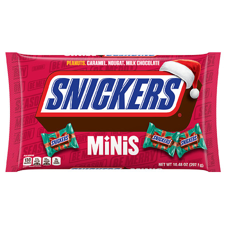 Bring a bag of minis to share at Christmas parties and office celebrations; Celebrate Christmas with peanuts, caramel, nougat, and milk chocolate; Contains one (1) 10.48-ounce bag of SNICKERS Christmas Candy Minis Size Chocolate Bars; Contains Peanuts, Milk, Egg, Soy; May Contain Tree Nuts; Use individually wrapped SNICKERS Minis as delightful stocking stuffers