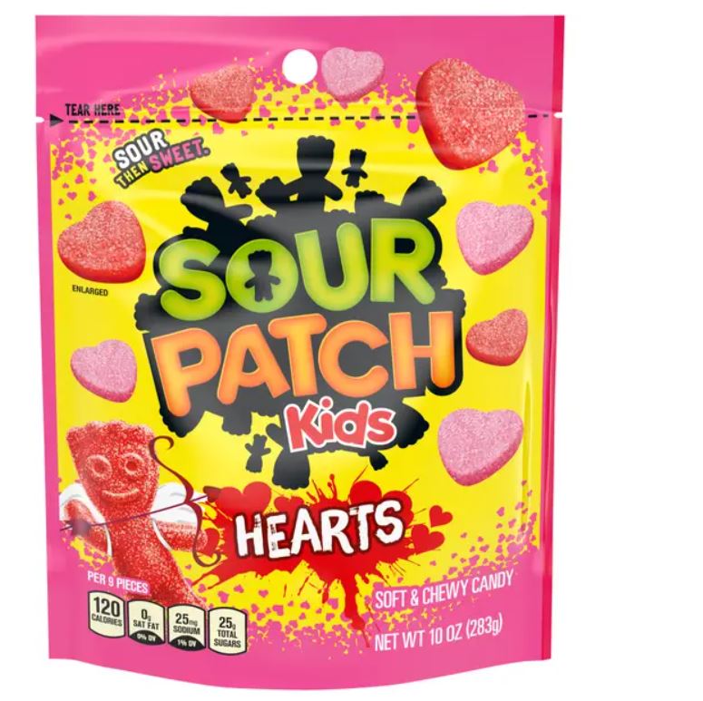 A MISCHEVIOUS VALENTINE - SOUR PATCH KIDS VALENTINE CANDY HEARTS ARE MISCHIEF-FILLED SOUR THEN SWEET TREATS. SOFT, CHEWY, AND FUN, THESE CUPID-APPROVED HEART-SHAPED CANDIES COME IN FUN REDBERRY AND PINK STRAWBERRY FLAVORS TAHT'LL SWEETEN YOUR VALENTINE'S DAY! tHE RESEALABLE BAGS OF SOUR PATCH KIDS CANDY ARE GREAT FOR CLASSROOM PARTIES, OFFICE GATHERINGS, AND EVERYDAY TREATS.Specifications