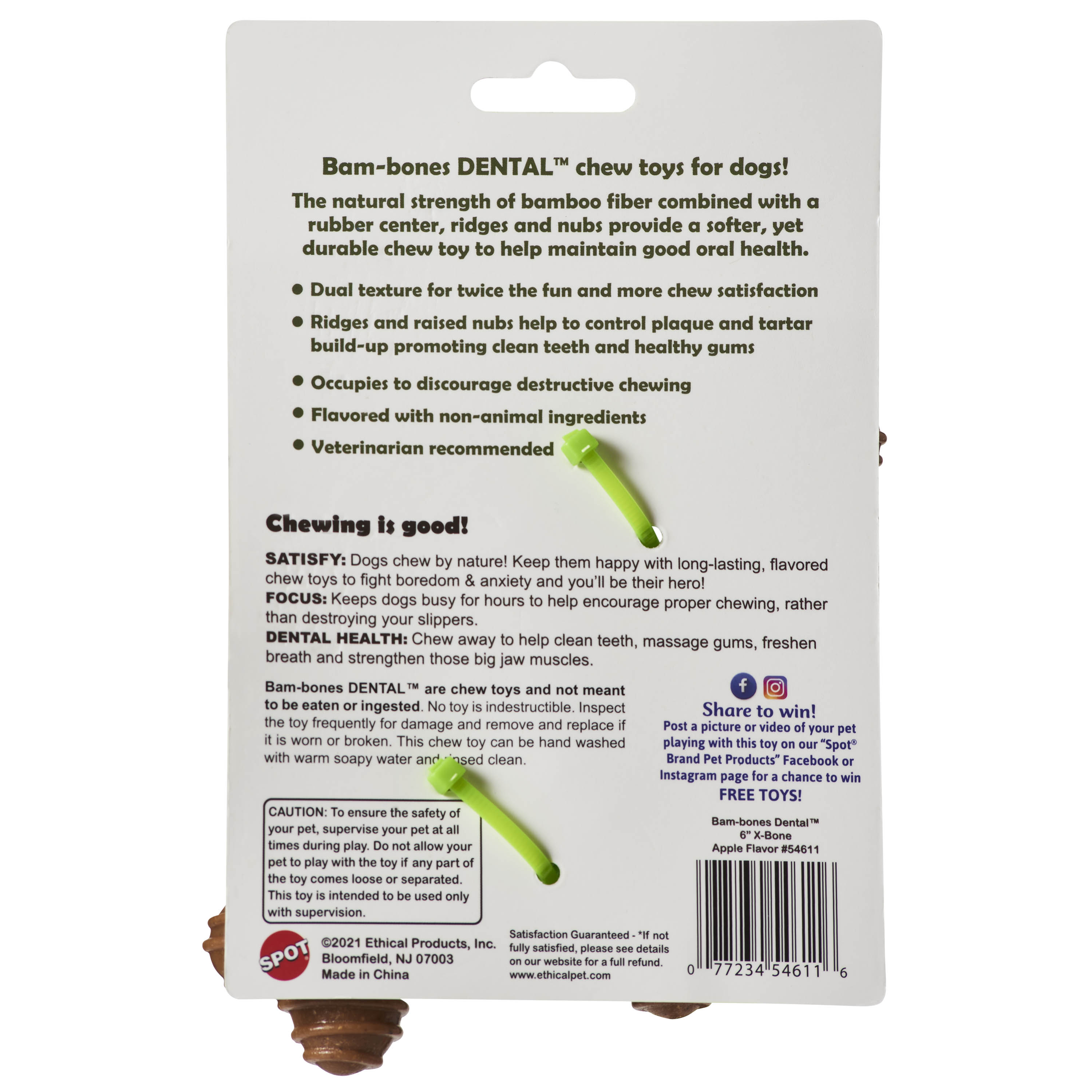 Bambones formulation with a TPR overlay. Dual textures with nubs help keep teeth and gums healthy. Perfect for moderate chewers. X-Bone shape with apple flavor.Specifications
