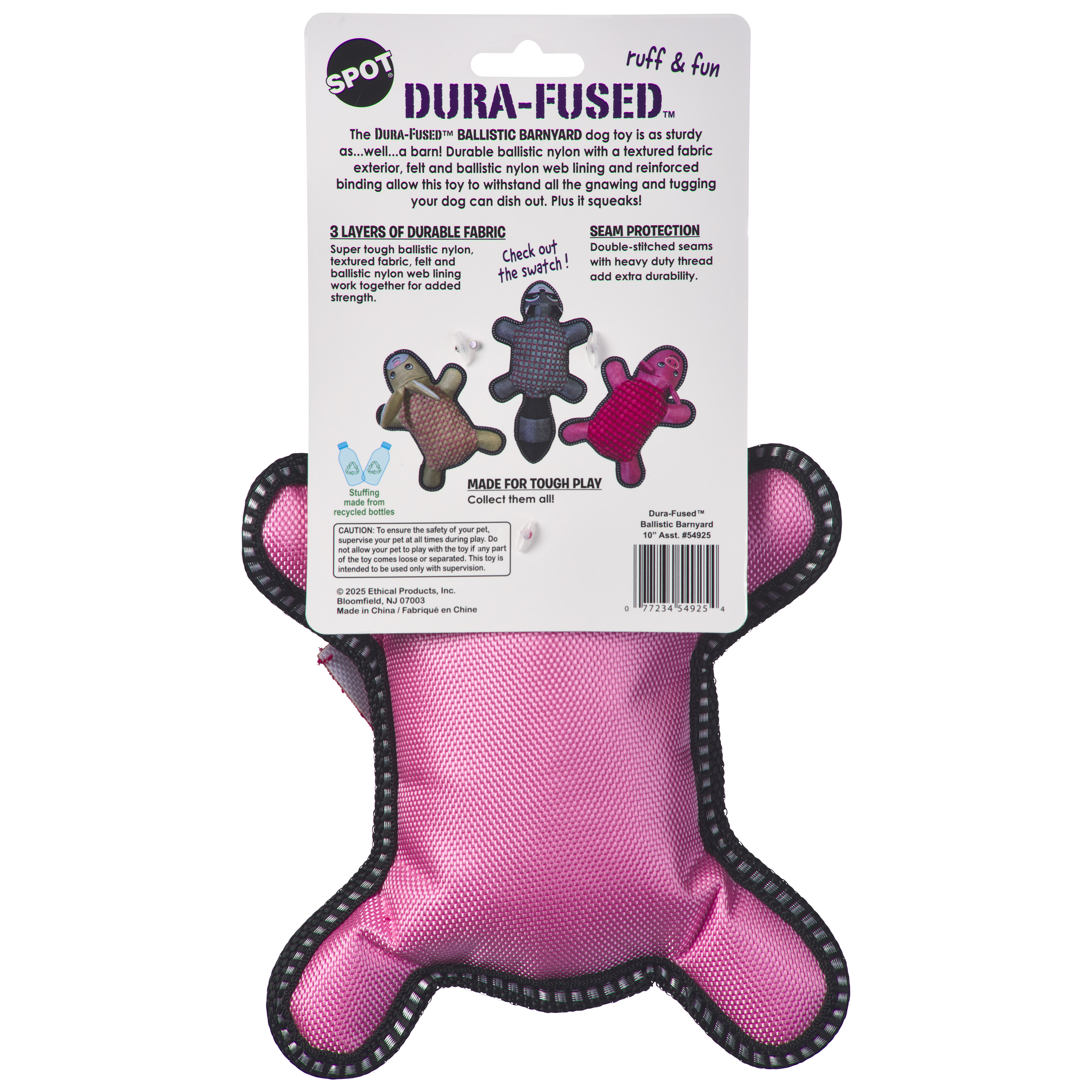 (WE CANNOT GUARANTEE A SPECIFIC CHARACTER) If you'd like us to choose for you, we are more than happy to do so. If not, please visit us in store to pick your favorite character.The Dura-Fused ballistic barnyard dog toy is as sturdy as...well...a barn! Durable ballistic nylon with a textured fabric exterior, felt and ballistic nylon web lining and reinforced binding allow this toy to withstand all the gnawing and tugging your dog can dish out. Plus, it squeaks!Specifications