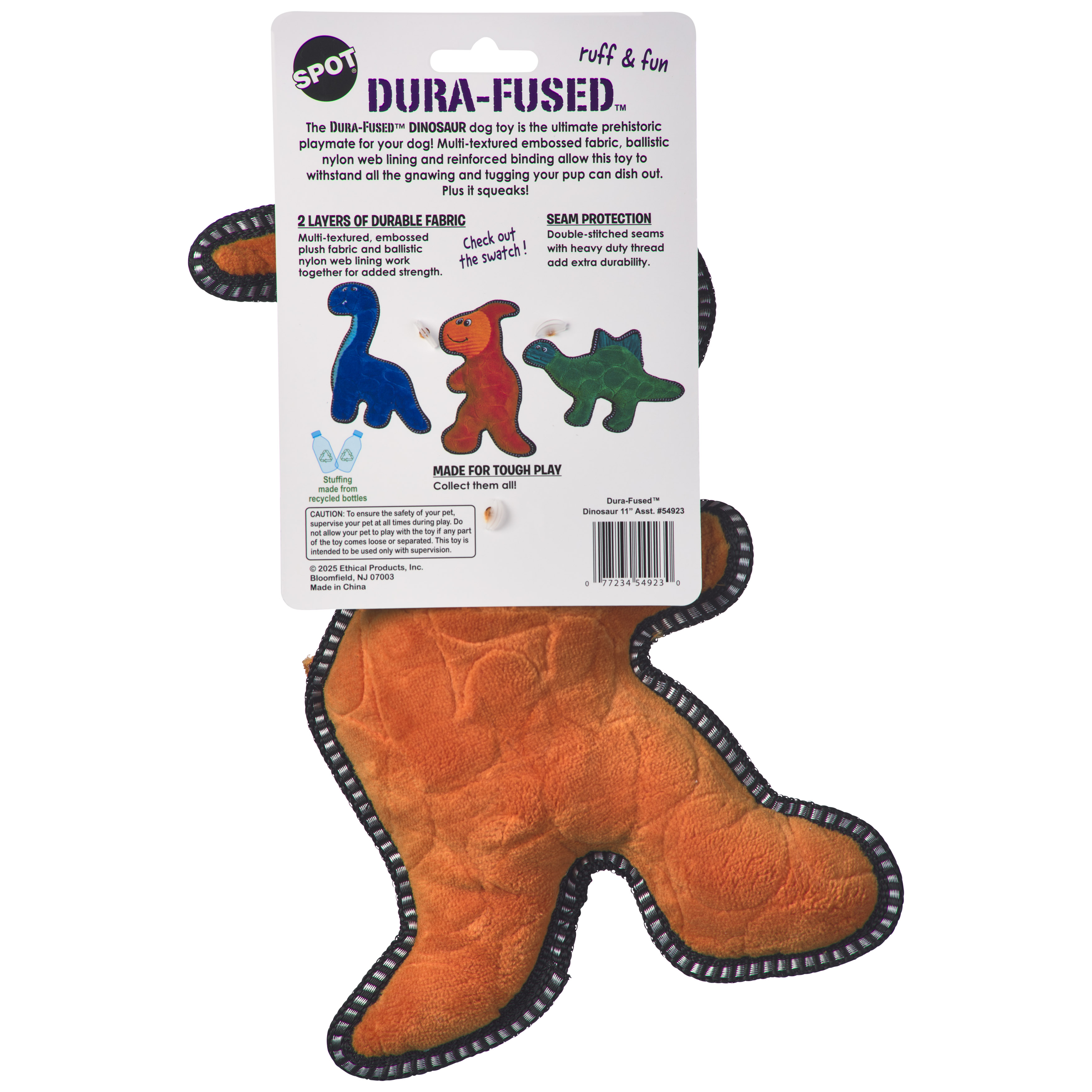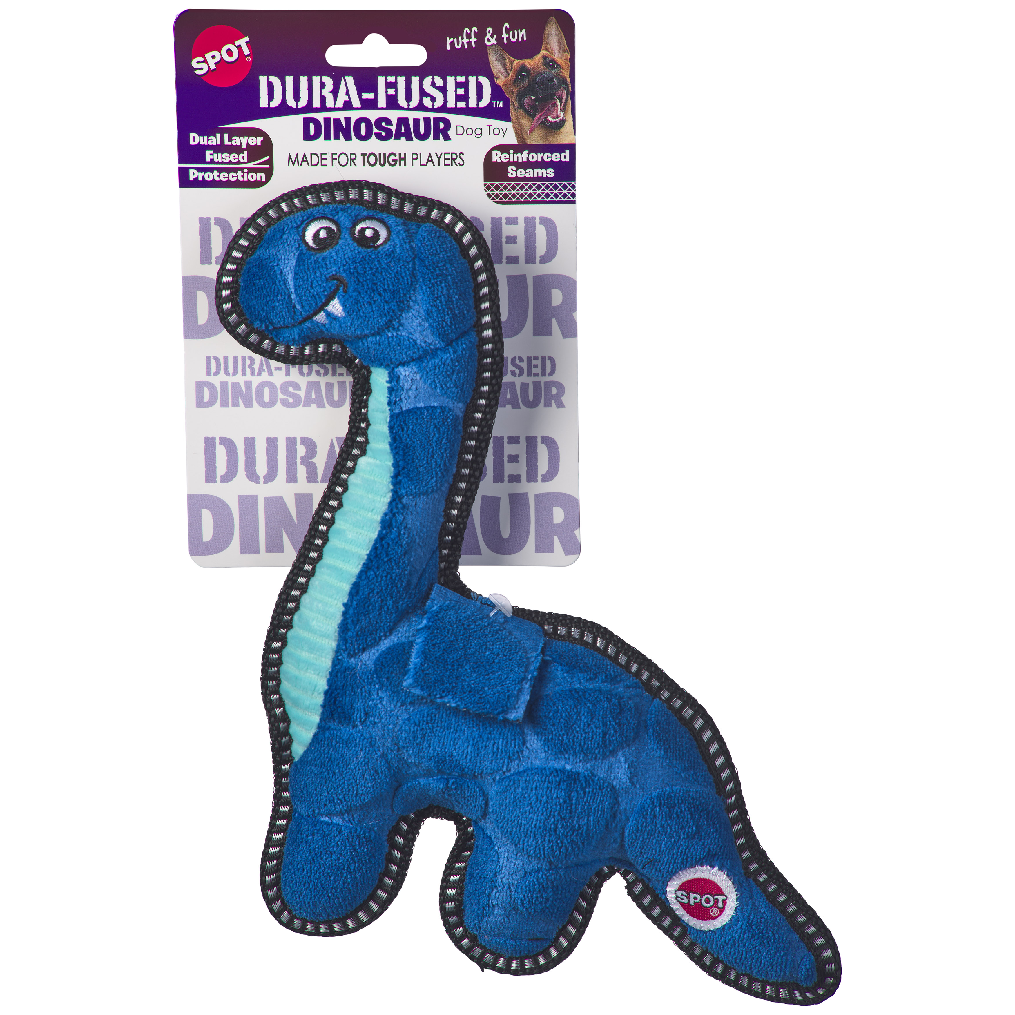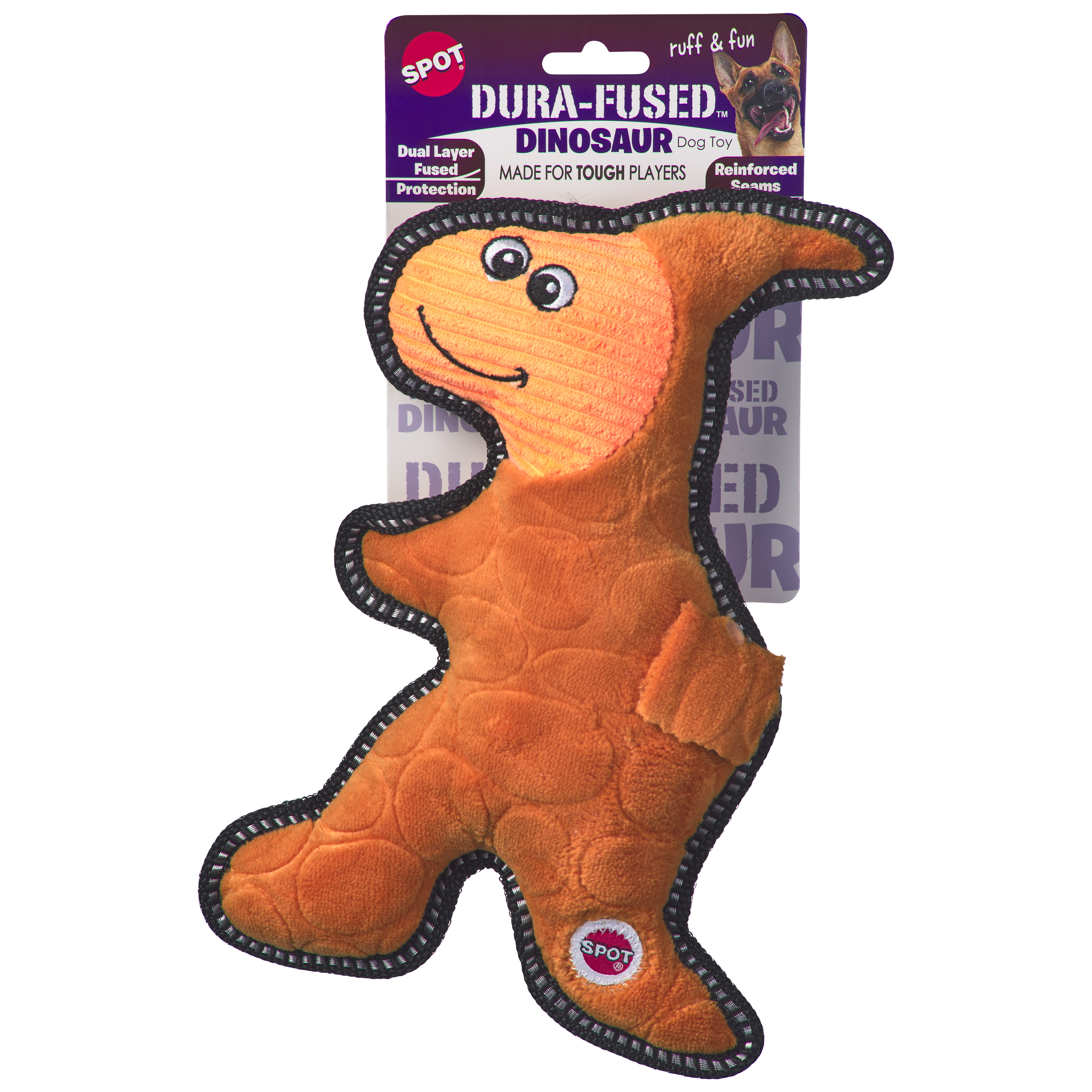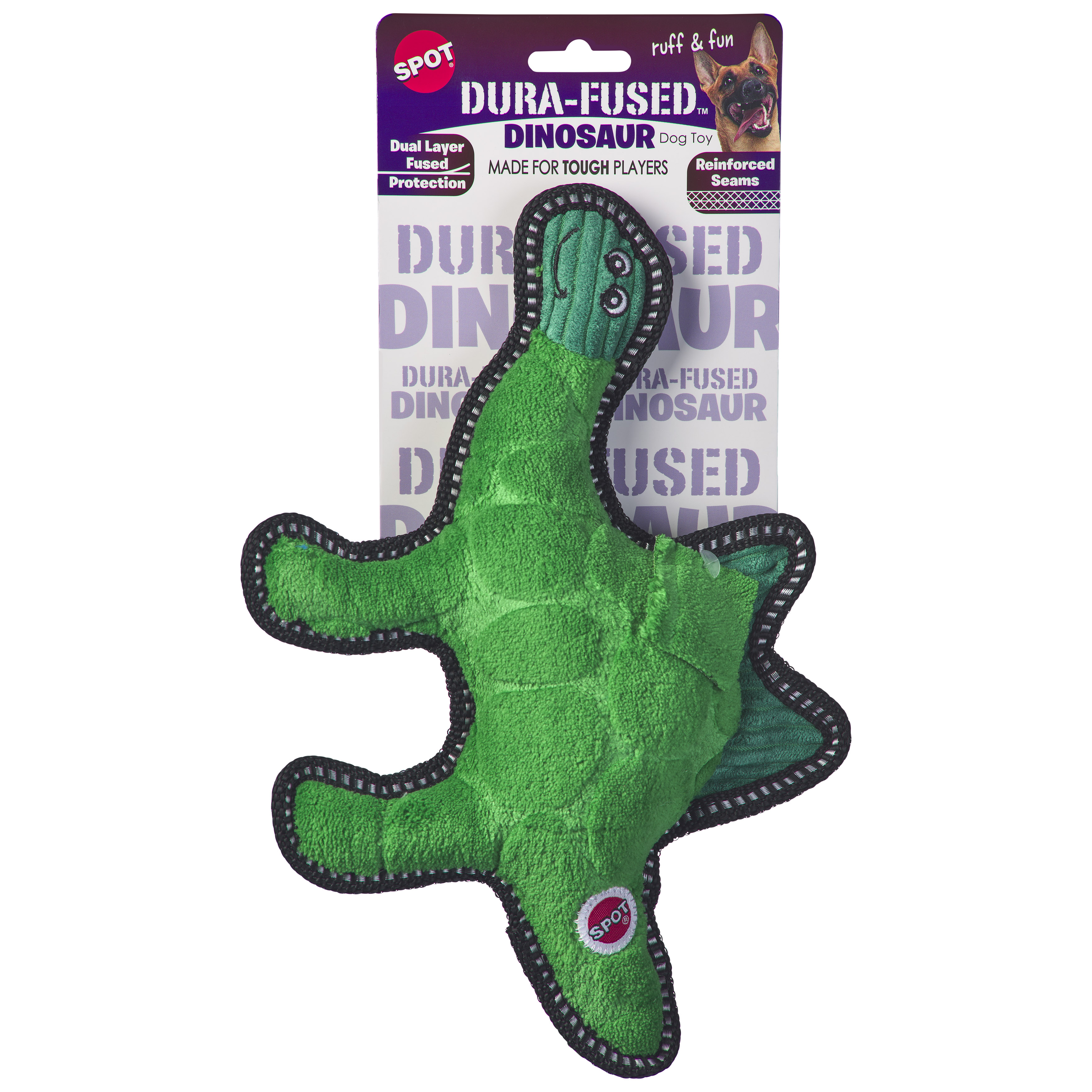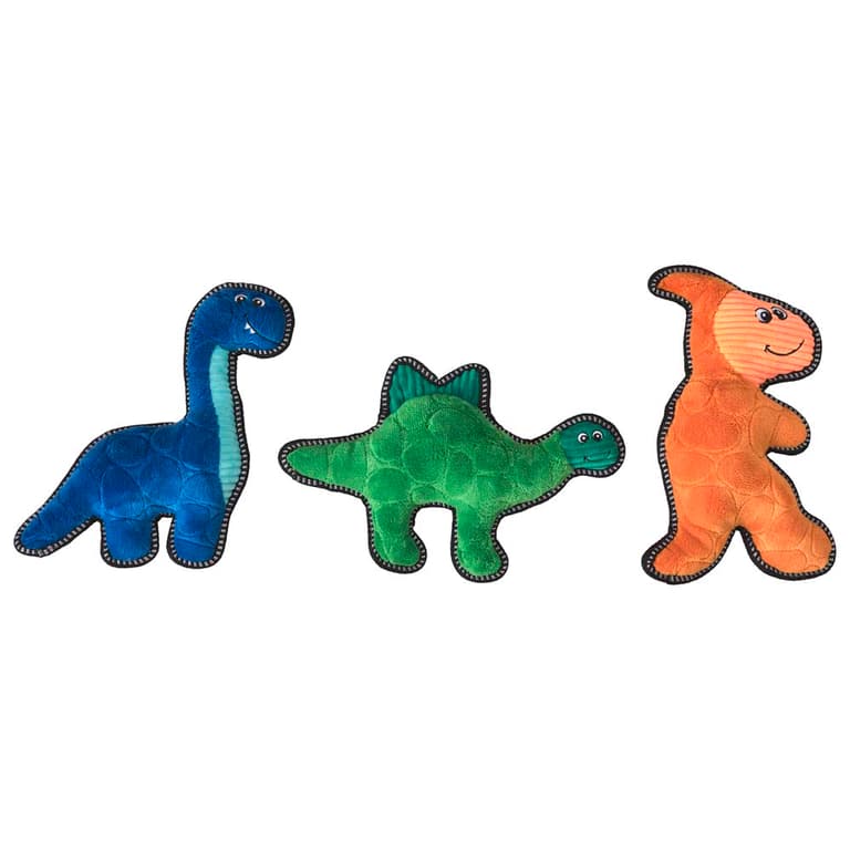 Double stitched seams with heavy duty thread; Dura-Fused Dinosaur 11"; Made for tough play; Multi-texutred, embossed plush fabric and ballistic nylon we lining work together for added strength; Ruff & fun with a squeaker inside