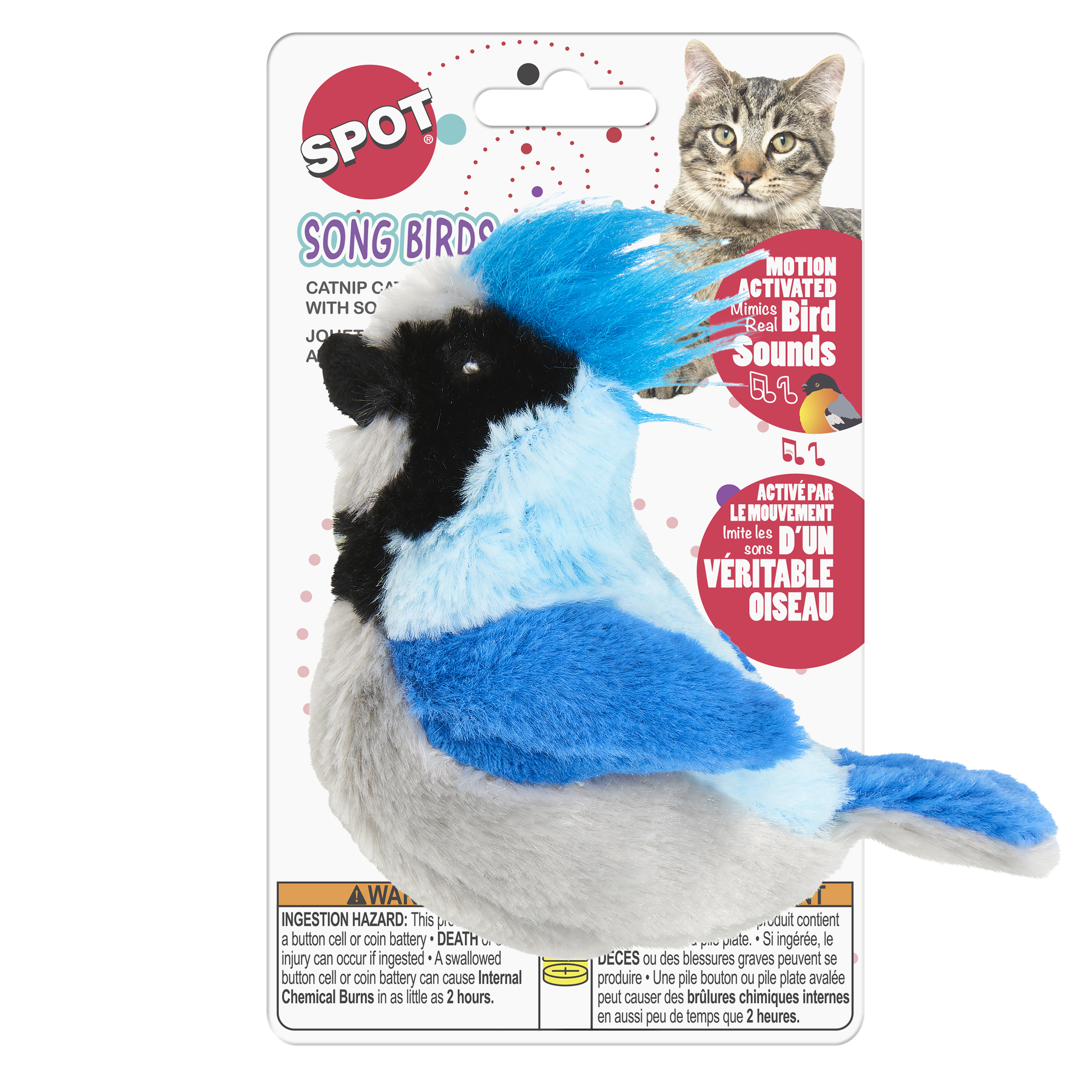Contains catnip; Mimics real bird sounds when they are batted around; Motion activated; Soft plush