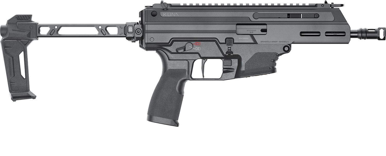 The all-new Kuna from Springfield Armory is a PDW built to deliver exceptional performance in a portable package. Its monolithic aluminum upper provides a durable frame, housing a roller-delayed operating system that dramatically reduces felt recoil. Fully ambidextrous, this feature-rich platform is available in 9mm and comes with two 30-round magazines. Precision manufactured for optimal fit and function the Kuna’s small profile, nimble handling and prolific capacity make it a fierce personal defense platform.Specifications