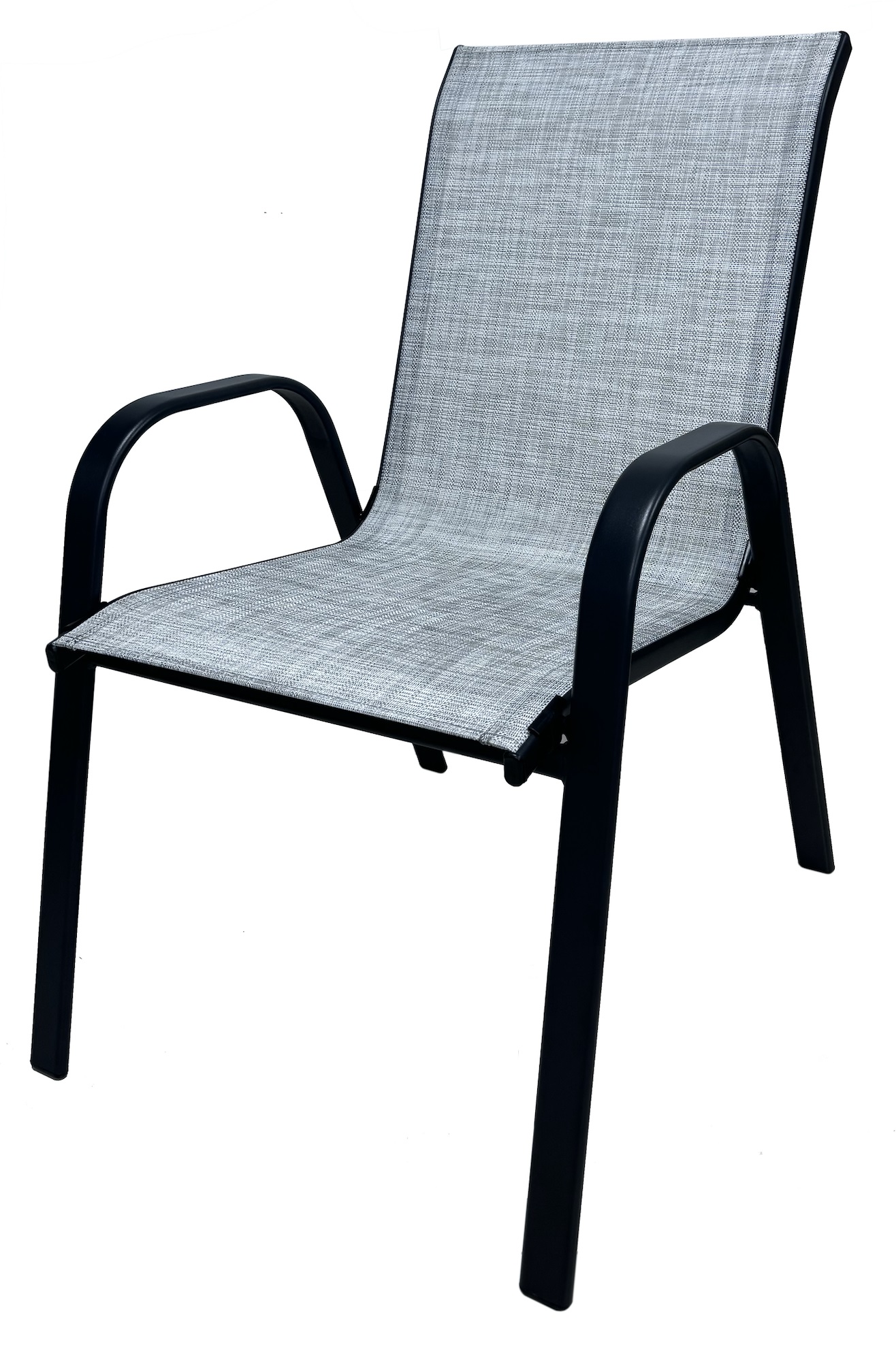 Stacking Black Powder Coated Steel Framed Sling Chair with Durable Textilene Sling Fabric In Black/ White Weave Pattern; Dining Chair w Powder Coated Steel Frame; Non scuff feet; Overall Size 35.5"H x 21.6"W x 28.4"DSpecifications