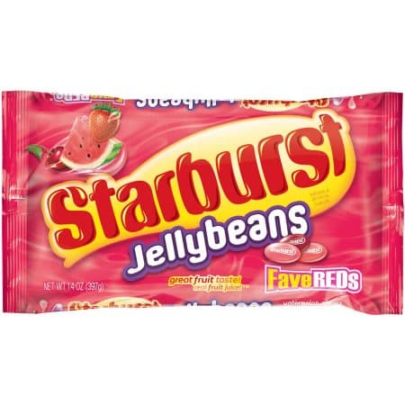 Spring has sprung! Celebrate Easter with the fruity, chewy goodness of STARBURST FaveREDs Jellybeans Easter Candy. Stocked with everyones favorite STARBURST Fruit Candy flavors, this bag features watermelon, cherry and strawberry flavors, and is sure to sprout smiles on the faces of your friends and family. Make Easter baskets and candy dishes pop with these delicious and festive candies. Stock up for the office with this bulk bag of festive treats so you can fill candy bowls at the front desk with bold, fruity flavor.Specifications