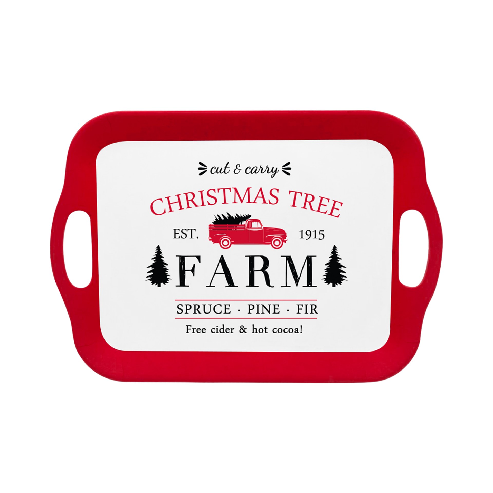 This Holiday serving tray is perfect to use for Holiday get togethers with family and friends. The tray features a "Classic Christmas" Holiday Decorative Design and is made of unbreakable melanine. It rectangular in shape with handles at each end and measures 11.5 inches by 16.5 inches and is dishwasher safe(top shelf).Specifications