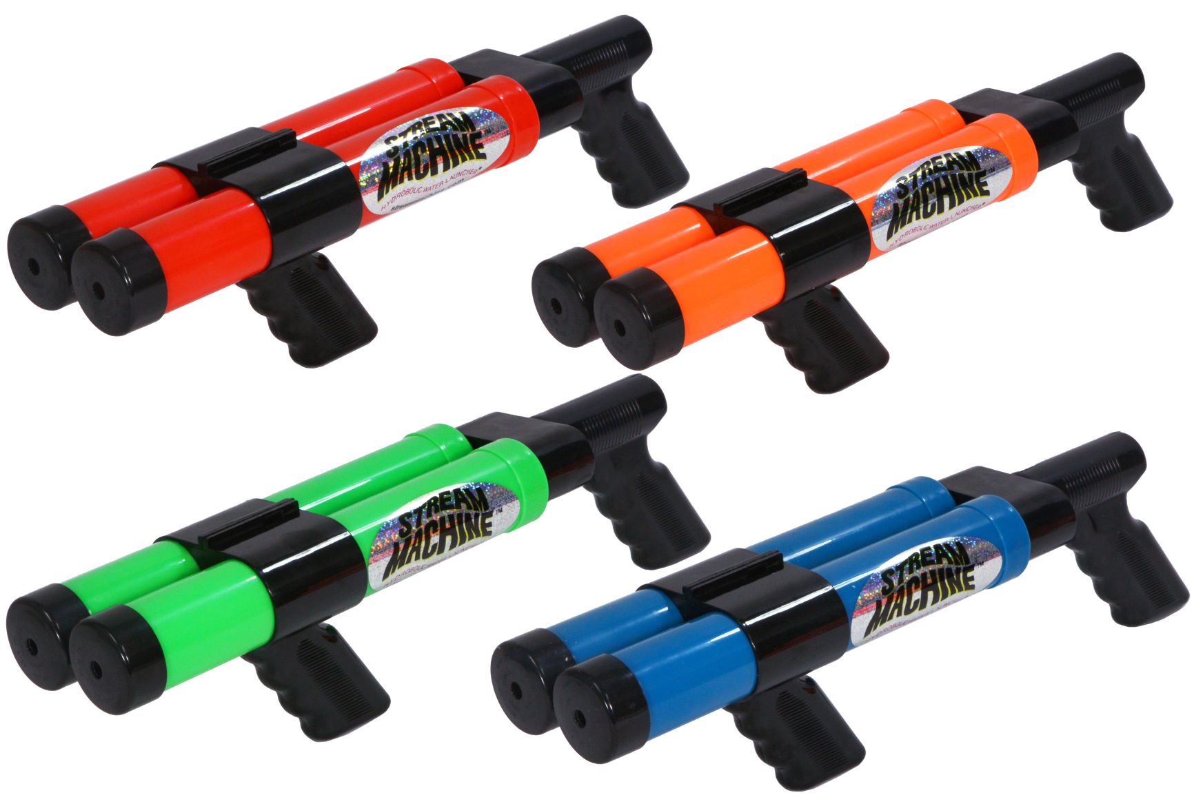 (we cannot guarnatee a specific color. If you would like us to choose for you we are happy to do so. If not, please visit us in store to choose your favorite color.)Double your impact with the Stream Machine DB-1200! This double-barrel water gun measures 17 inches long and is capable of shooting two 3/8-inch wide streams of water up to 70 feet.Specifications