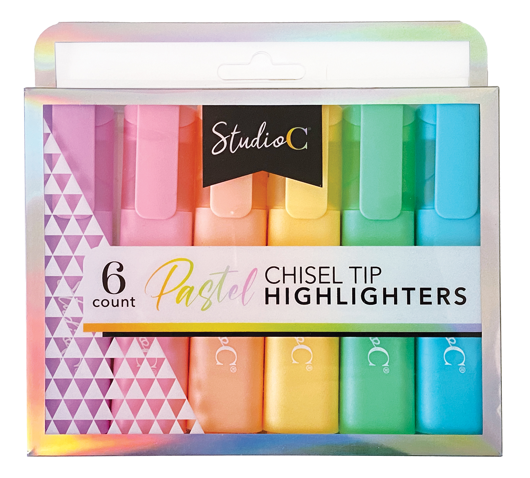 This pretty set of highlighters offers function with flare! Choose from Pink, Peach, Yellow, Green, Blue and Purple. With 6 pretty pastel colors, you can color code in style. The chiseled tip provides wide, smooth color. Each highlighter has a wide clip so that you can easily clip it to a notebook or binder.Specifications