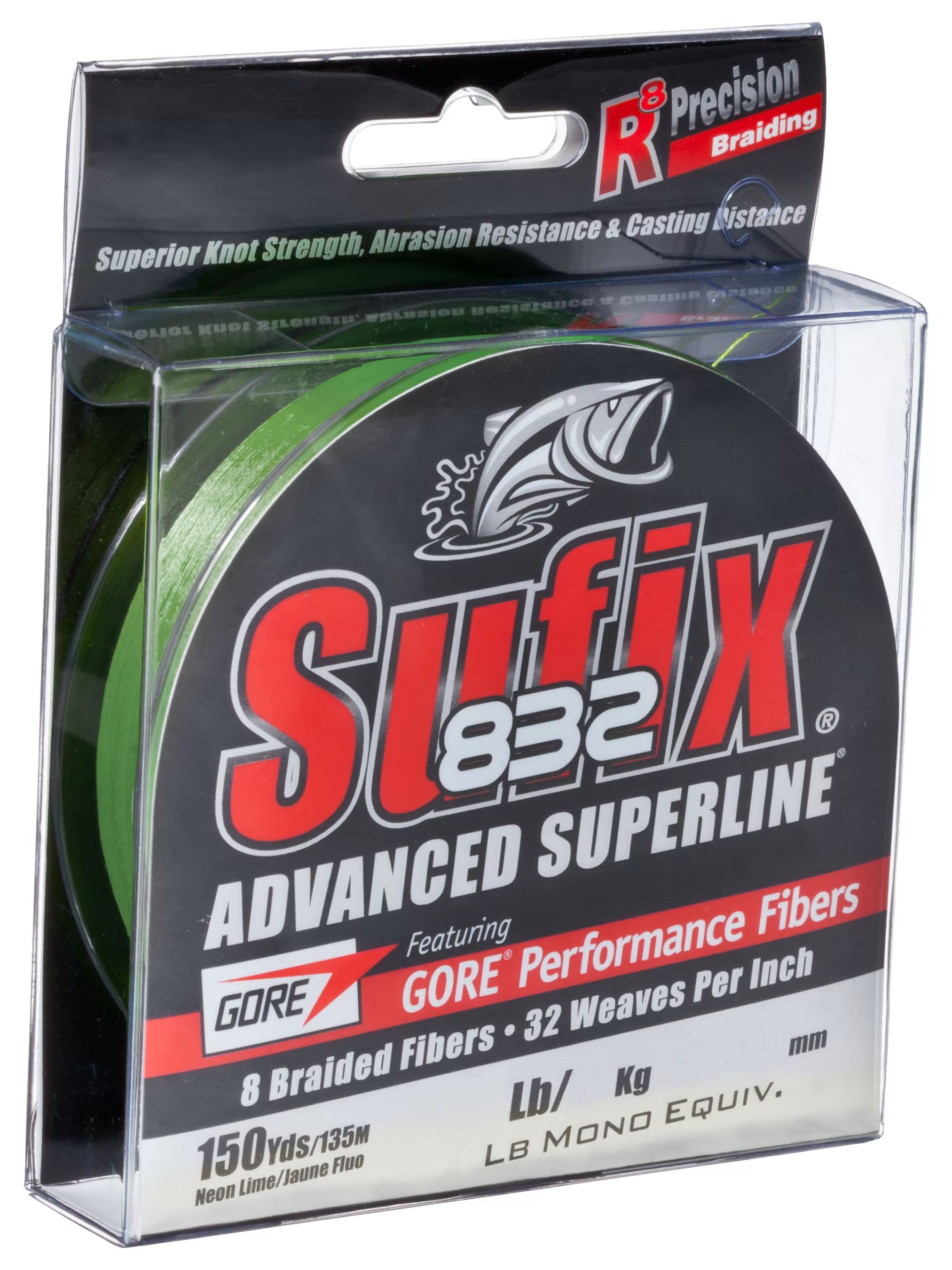 Sufix 832 Advanced Superline is the strongest, most durable small diameter braid on the market. R8 Precision Braiding and fiber technology provides superior strength, roundness and line consistency. 832 Advanced Superline has 8 fibers (7 HMPE fibers plus 1 GORE Performance Fiber) and 32 weaves (pics) per inch.GORE Performance Fibers improve abrasion resistance, increase casting distance & accuracy and reduce line vibration. HMPE fibers provide high strength & sensitivity, hydrophobic water-repellent protection and small diameter.Specifications