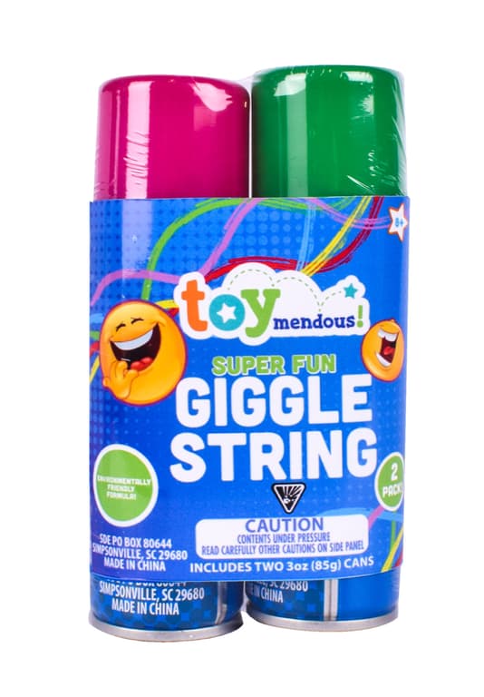 Brighten up any celebration with the kid-favorite party toy, Giggle String! One pack comes with two different colored cans to add a colorful variety to your playtime! Take your streamer string outside and spray it anywhere to add a sprinkle of color. This is the perfect toy to get kids excited to get outdoors and away from screens! A must have addition to any surprise party, or backyard event with friends and family.Specifications