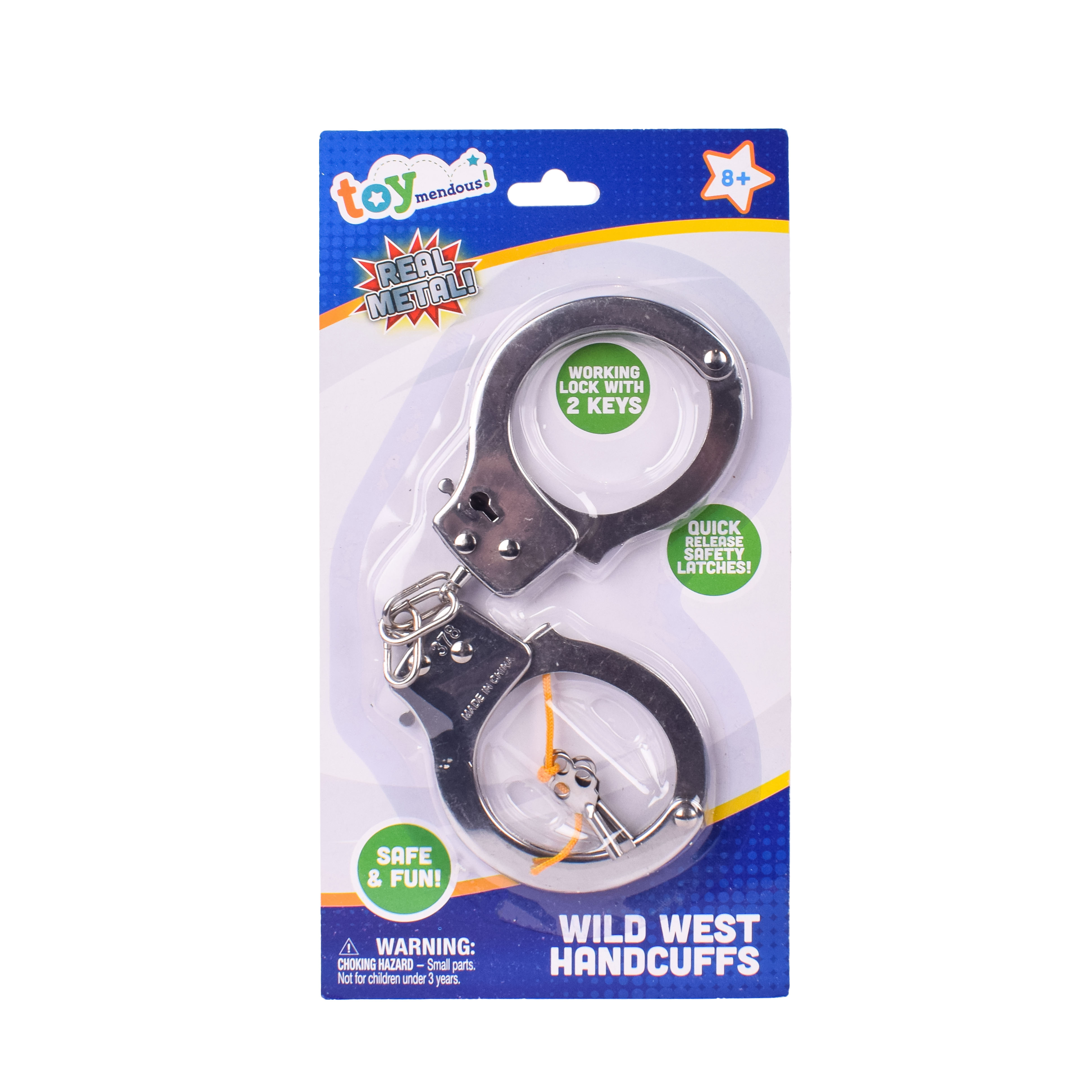 Lock up the bad guys and clean up the town with your very own set of Wild West Cowboy Handcuffs. Made out of sturdy metal, cuffs are a realistic and durable choice for a day of pretend play. Handcuffs come with a working lock and two keys. Simply insert the key into the keyhole and turn to open the handcuffs. Lose a key? Not to worry, these cuffs feature a safety latch for quick release. Wrangle the bandits and take 'em to the clink!Specifications