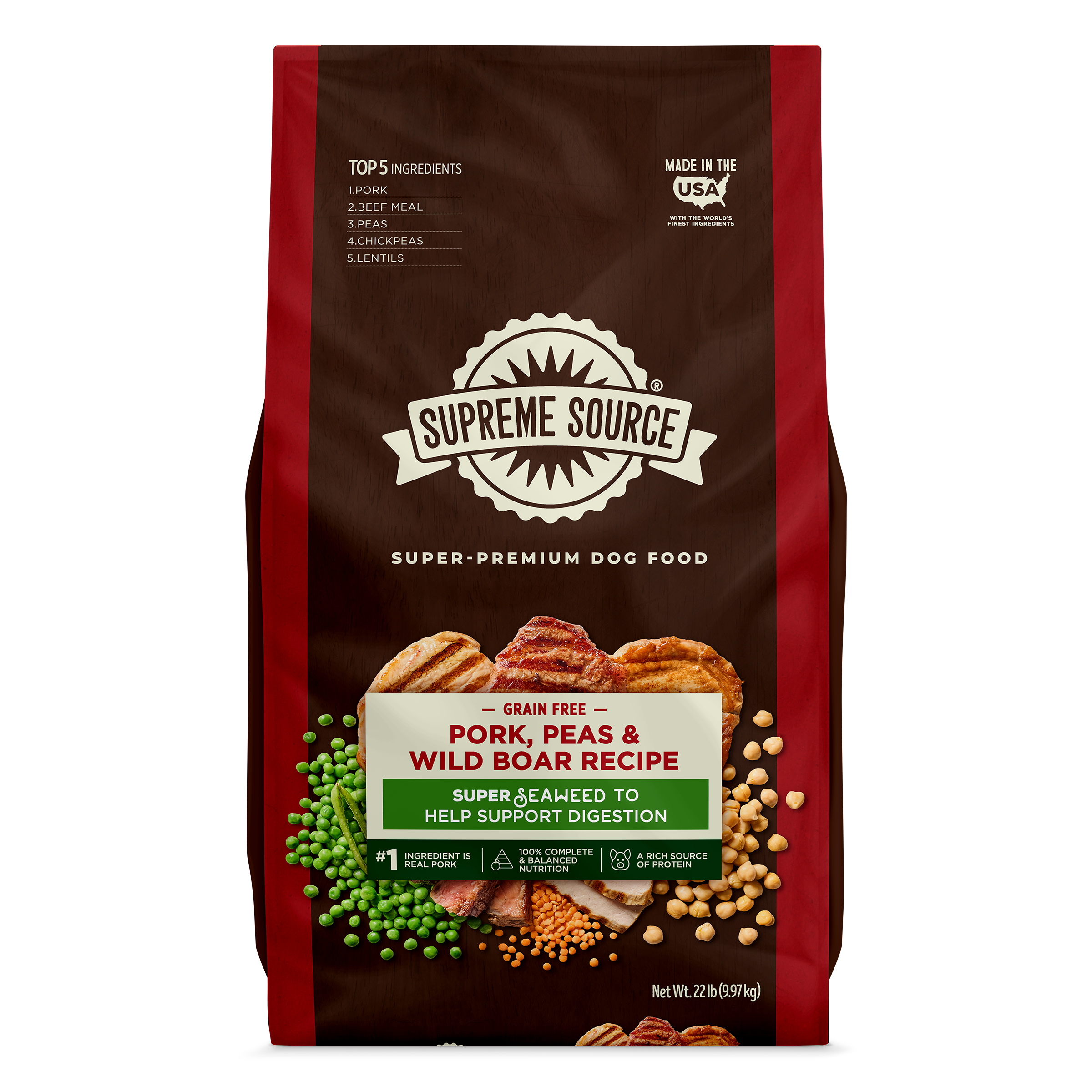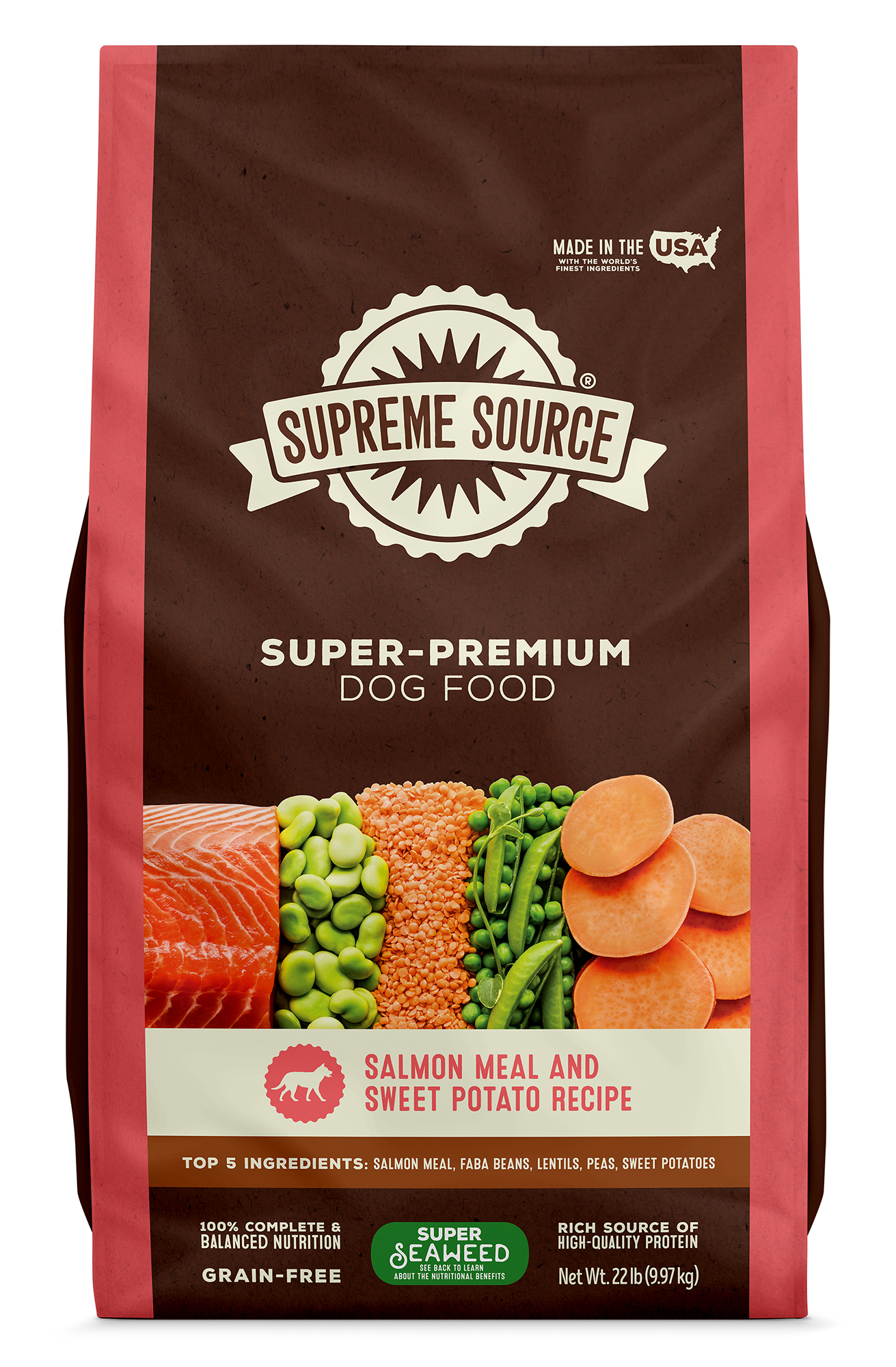 Supreme Source Salmon Meal & Sweet Potato Recipe Grain-Free Dry Dog Food, 22-lb bag; Give your precious pup the best in advanced nutrition when you feed him Supreme Source Salmon Meal & Sweet Potato Recipe Grain-Free Dry Dog Food. This high-quality food is made using premium ingredients that are sourced, formulated, produced and packed under the watchful eye of family-owned American Pet Nutrition. Salmon meal, which contains even more protein than fresh salmon, is the very first ingredient, followed by real fruits and vegetables that deliver 100% complete nutrition with all the vitamins and antioxidants he needs to thrive. In addition to being 100% grain-free, this food is made without the use of corn, soy, artificial flavors or artificial colors.Specifications