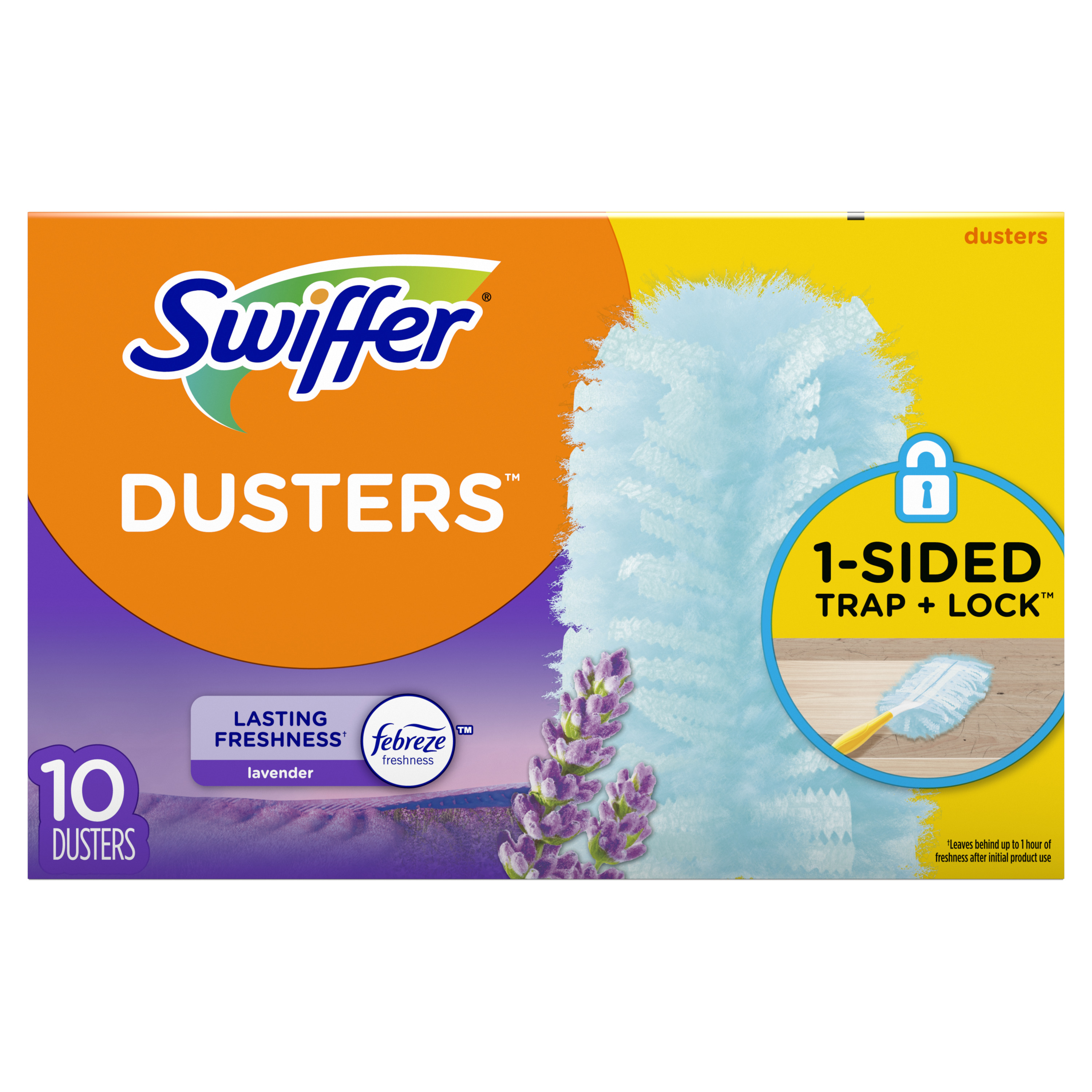 Swiffer Dusters Refill for Cleaning, Feather & Microfiber Duster Alternative, Lavender, 10ct both traps and locks in the dust. Perfect for fan blades, blinds, car interiors, keyboards, vents, bookcases and so much more. Made with spacially coated fibers to grap onto dust and not let go. Enjoy the lasting freshness of the lavender scent as you clean. Leaves behind up to 1 hour of freshness after initial use.Specifications
