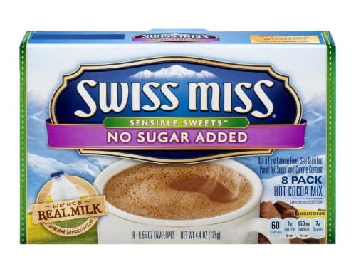 Swiss Miss Hot Cocoa Mix. Warm up in a most delicious way with Swiss Miss No Sugar Added Milk Chocolate Hot Cocoa Mix! The individually wrapped packets each contain the perfect amount of hot chocolate mix for a satisfyingly sweet treat without all the sugar. Made with premium milk chocolate for the rich and creamy Swiss Miss hot cocoa mix you love with no sugar added youll have all you need to warm up on a chilly morning afternoon or evening. Swiss Miss Hot Cocoa is always made with real milk from a real dairy is Wisconsin. So when you pour a cup of Swiss Miss youre getting a Taste of Real in every wholesome sip. Cozy up with the Classic and indulge with a mug of me-time. Swiss Miss will warm you up in no time.Specifications