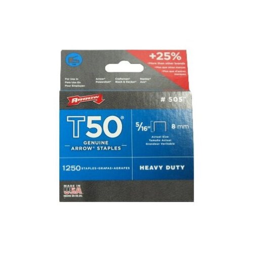 The Arrow 5/16-inch T50 Staple are a great heavy-duty staple for projects around the house or the job site. Top uses for the 5/16 inch leg length include roofing felt, upholstery, headboard coverings and valances. Generally, the 5/16 in. leg length works well stapling into medium to harder woods or when working with thinner material.Specifications