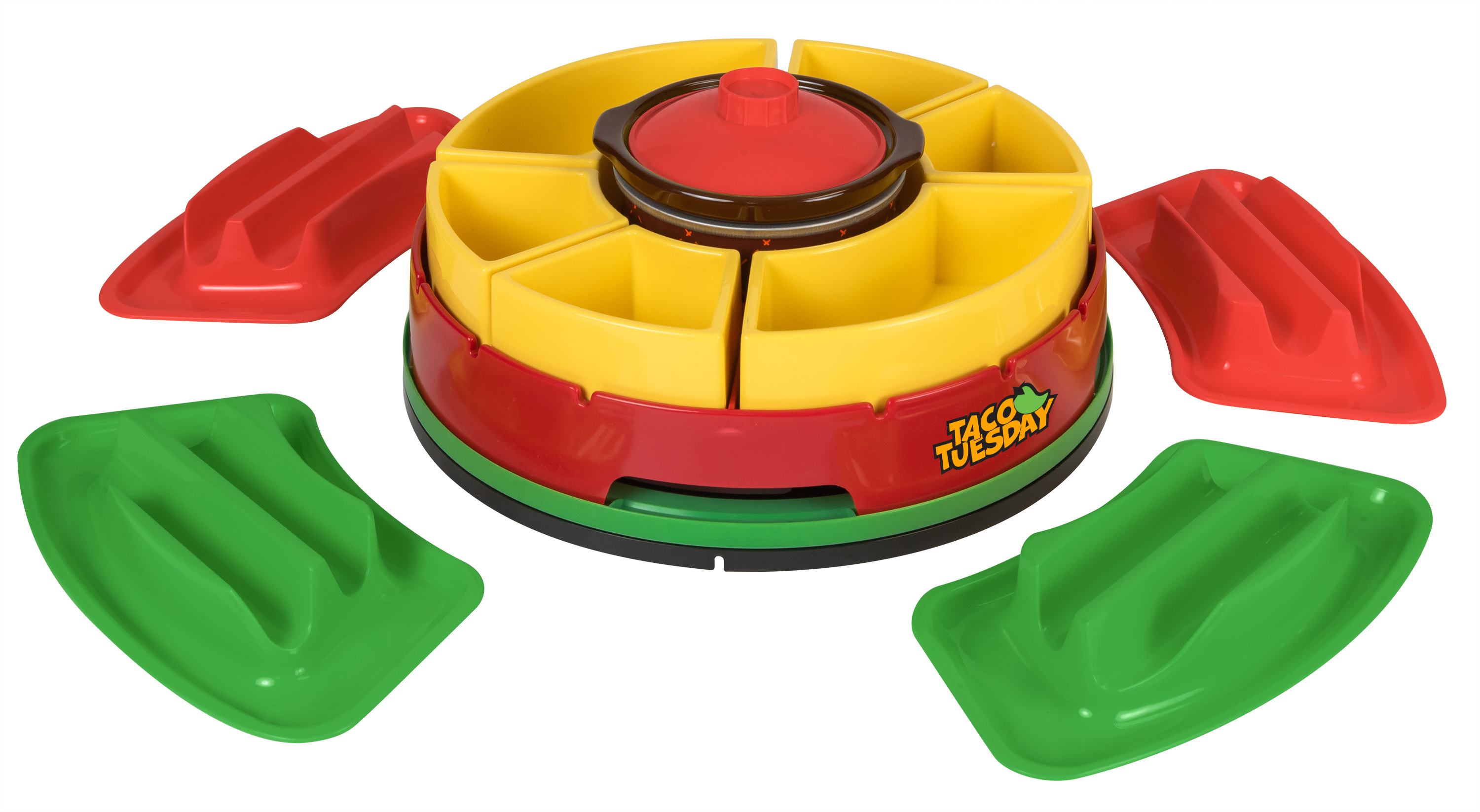 Includes 4 Hard-Shell Taco Holder or Soft-Shell Taco Holders; Lazy Susan Design Makes Taco Creations Easy!; Removable 16 Ounce Warming Hot Pot Keeps Cheese, Meat, Beans, Rice At The Perfect Temperature; Removable Topping Trays To Hold Your Lettuce, Cheese, Onions, Cilantro, Tomatoes, Salsa & More; Trays And Warming Hot Pot Remove For Easy Cleaning