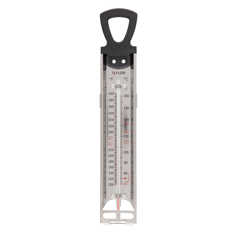 Large, easy-to-read to read temperature zonesRange 100°F to 400°F and 40°C to 200°CSpirit filled glass thermometer tubeCommon candy temperatures etched into casingInsulated handle with built-in pan clipDurable stainless steel construction12" longSpecifications