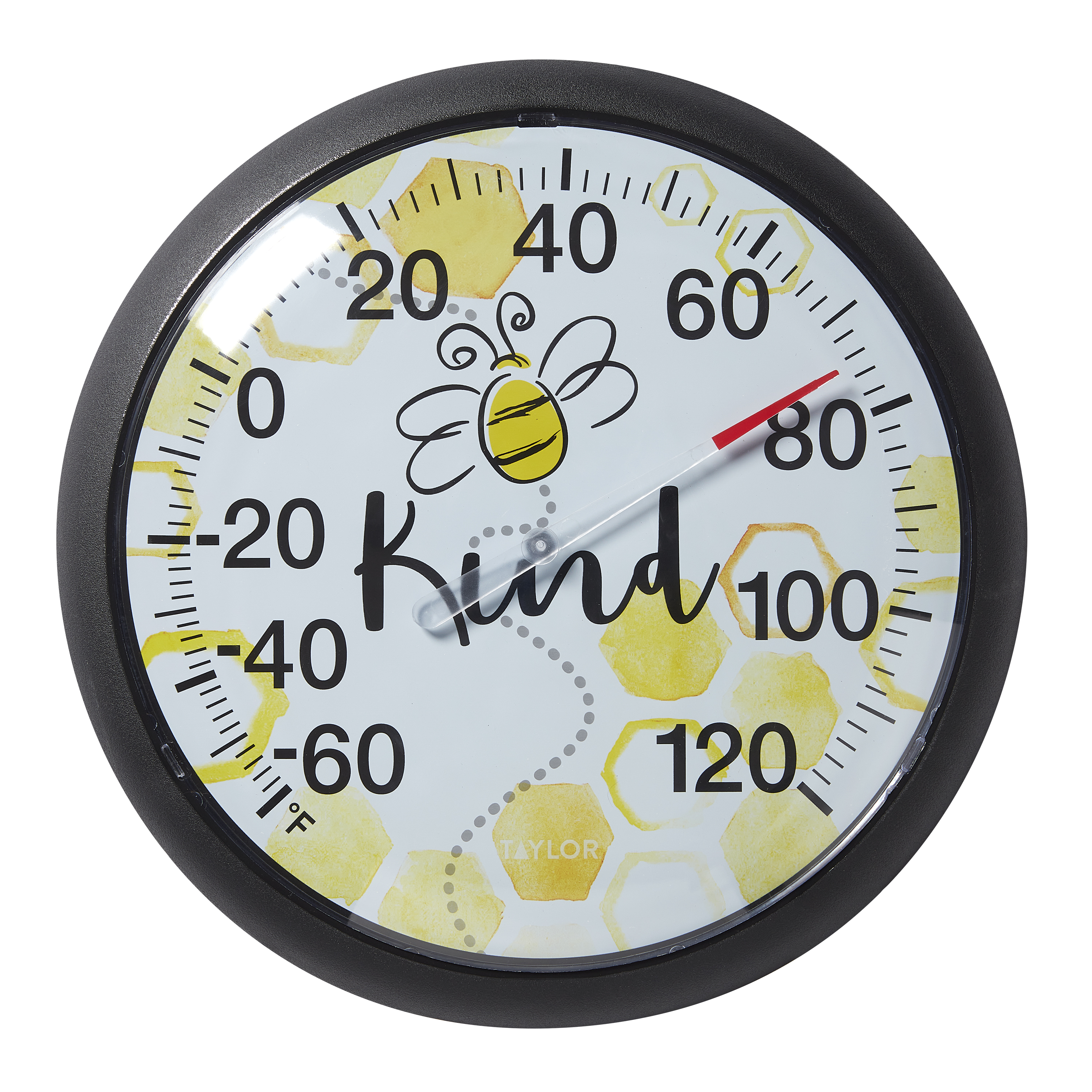 BLACK BEZEL FRAME; EASY TO READ NUMBERS; INDOOR/OUTDOOR; SHATTERPROOF LENS; TAYLOR 13.25IN BEE KIND ROUND PLASTIC THERMOMETER; TEMP RANGE -60F/120F