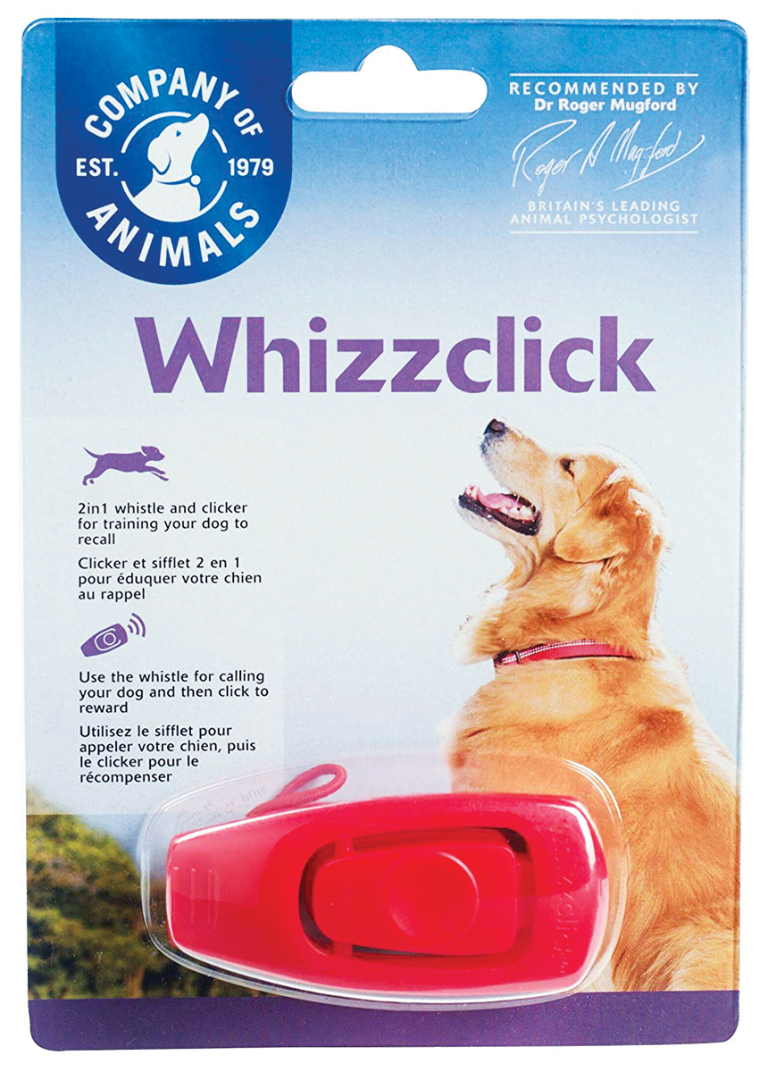 Essential and go-to training product for pet parents dog trainers and behaviorists. Combines a clicker & a whistle . Great way to train and teach your dog new tricks at any age. Great way to help with training at close and far distances. Low volume with high effectiveness for dogs sensitive ears. Red. Carded. The Whizzclick by The Company of Animals is a world-famous training aid that combines the utility of the clicker and dog whistle to assist with teaching and training dogs of all ages breeds and sizes. Created by Dr. Roger Mugford Whizzclick is popular amongst dog trainers behaviorists and dog parents alike.Specifications