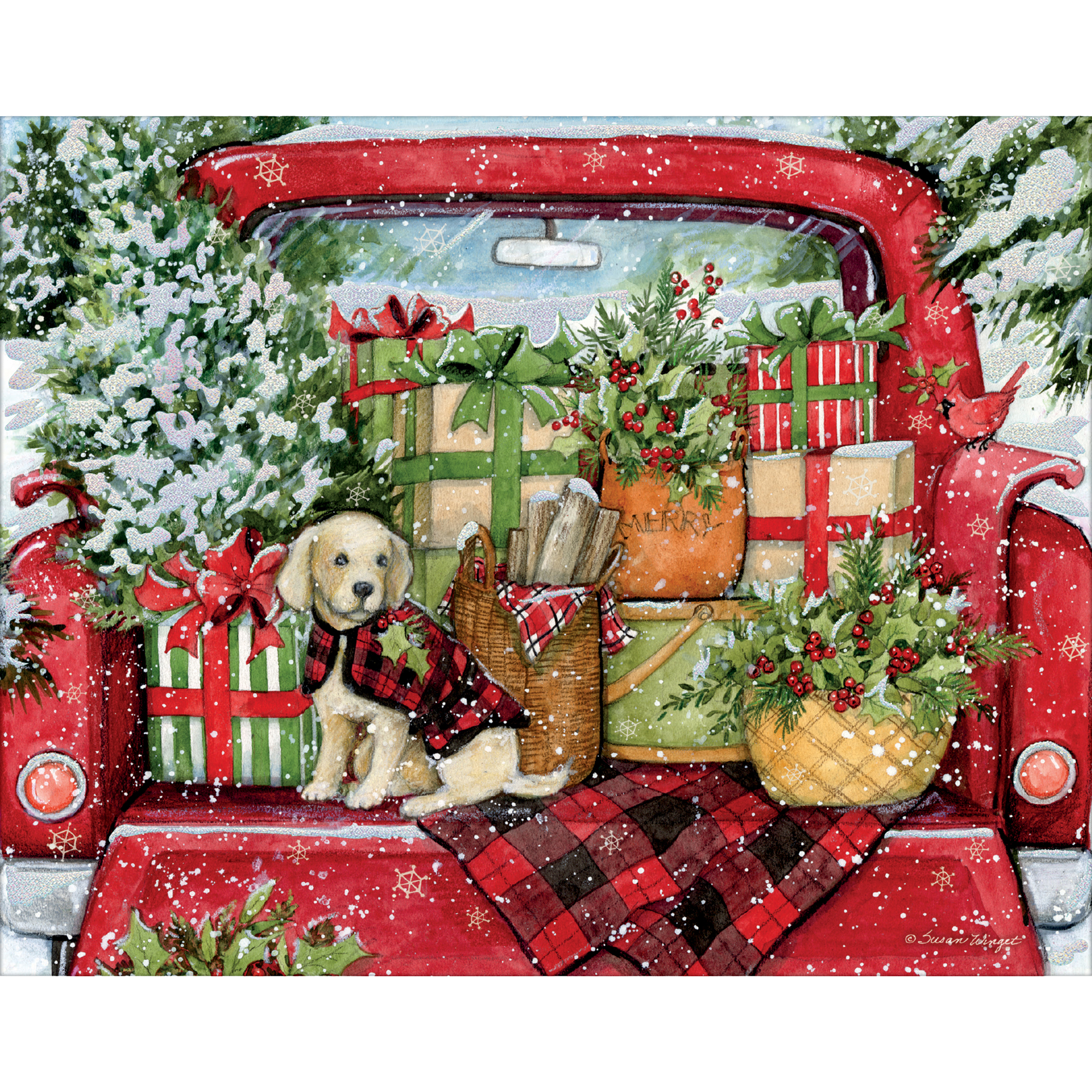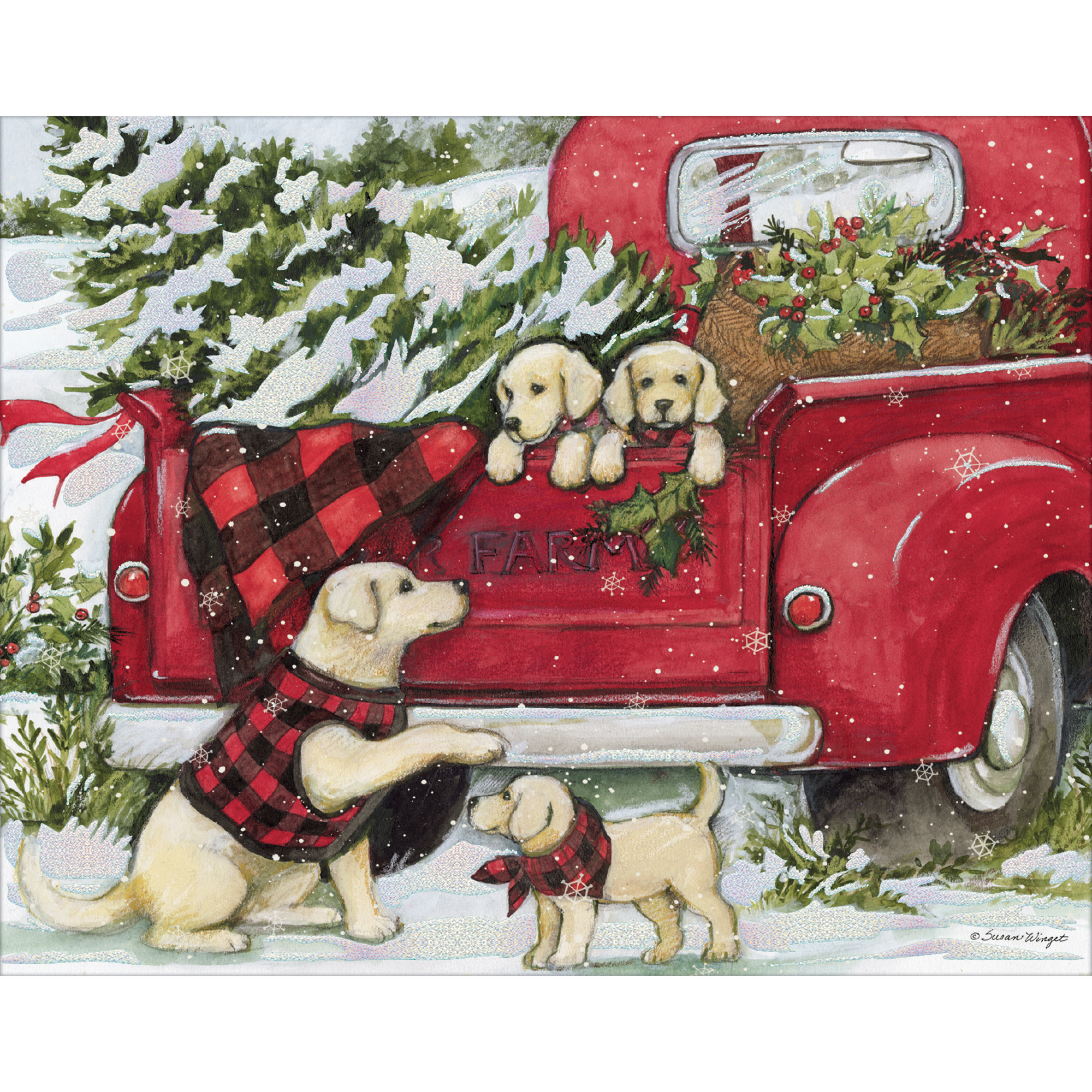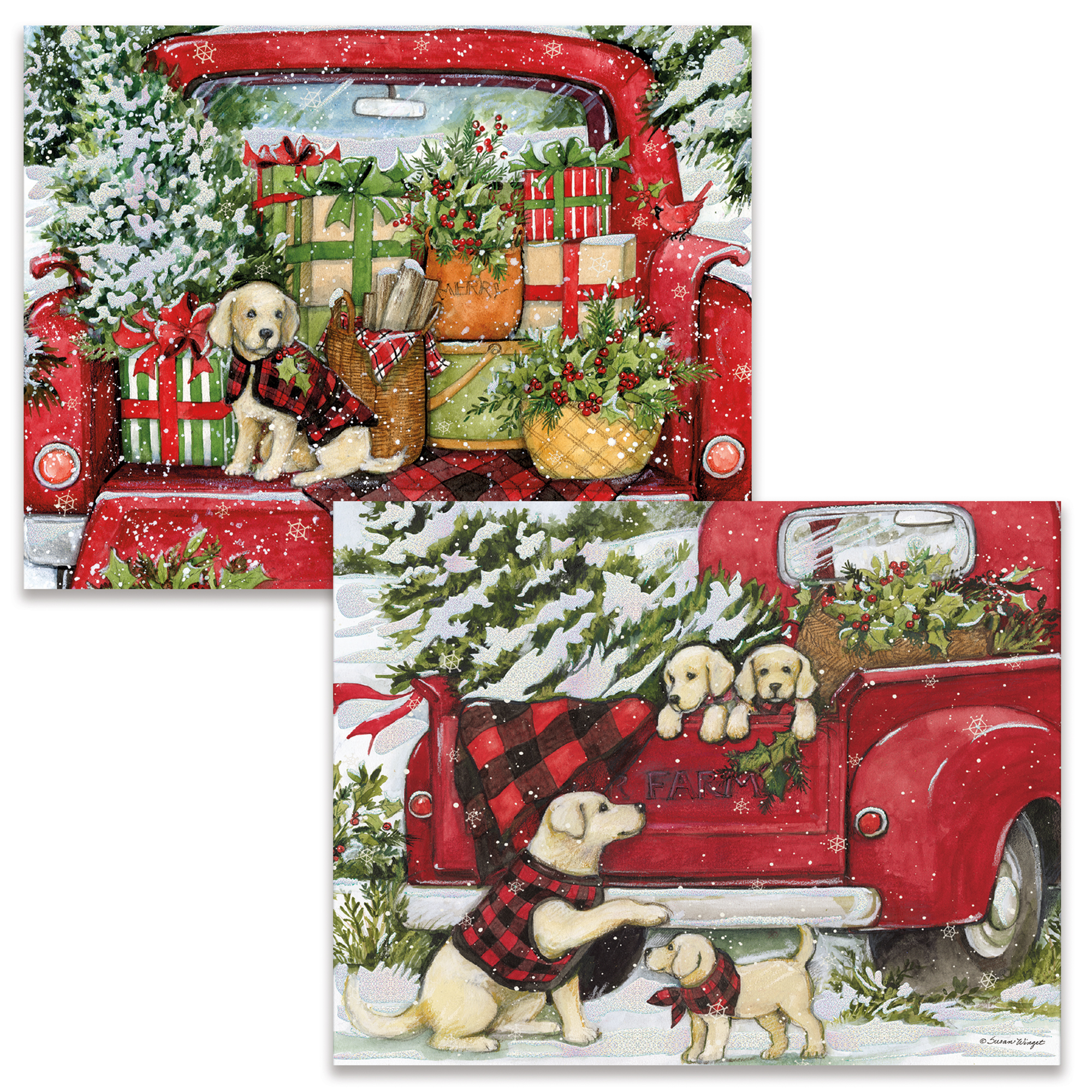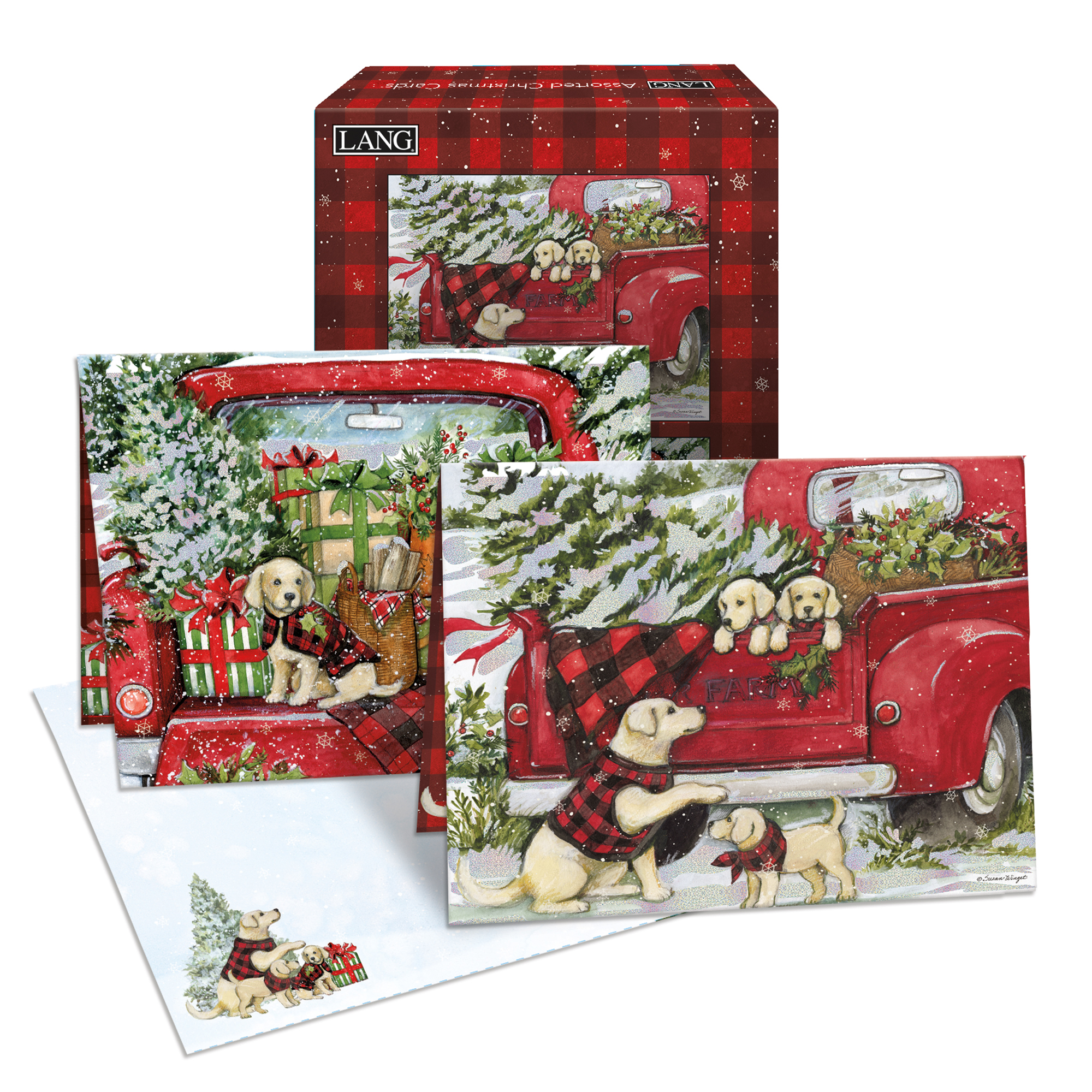 Send two varieties of artwork with LANG Format/Assorted Boxed Christmas cards. The Puppies & Presents Format/Assorted Boxed Christmas Cards include two variations of Susan Winget's Red Truck holiday artwork on linen embossed paper stock. Each assortment has its own holiday greeting inside.Specifications