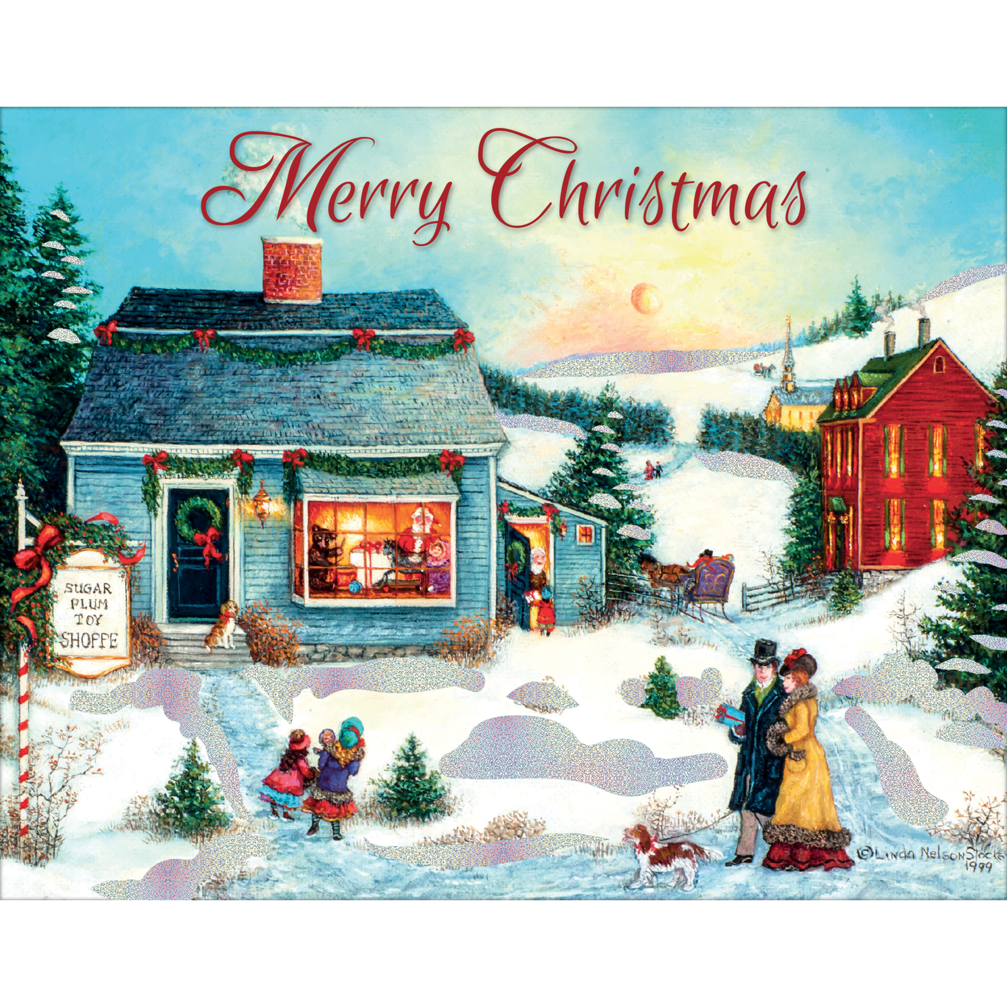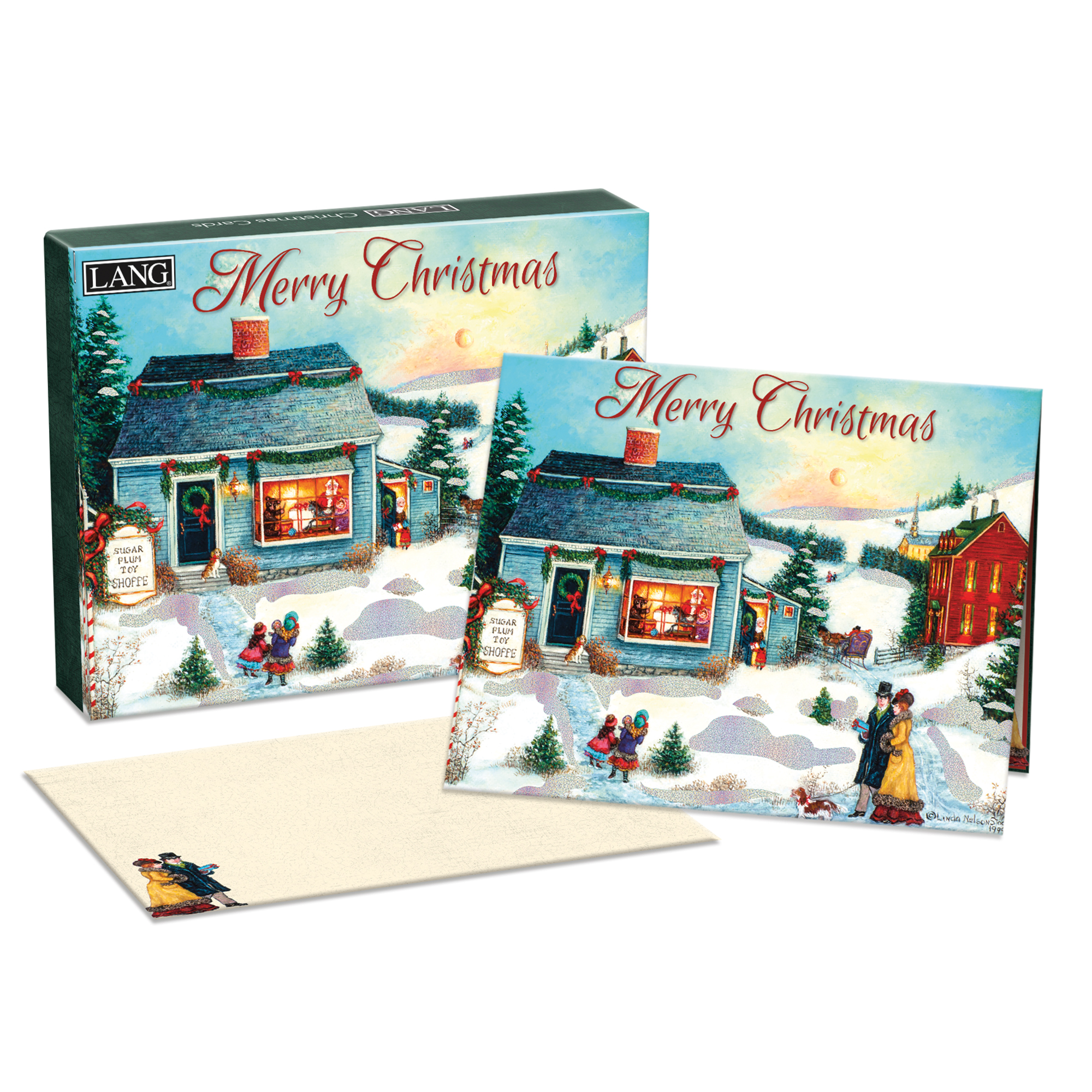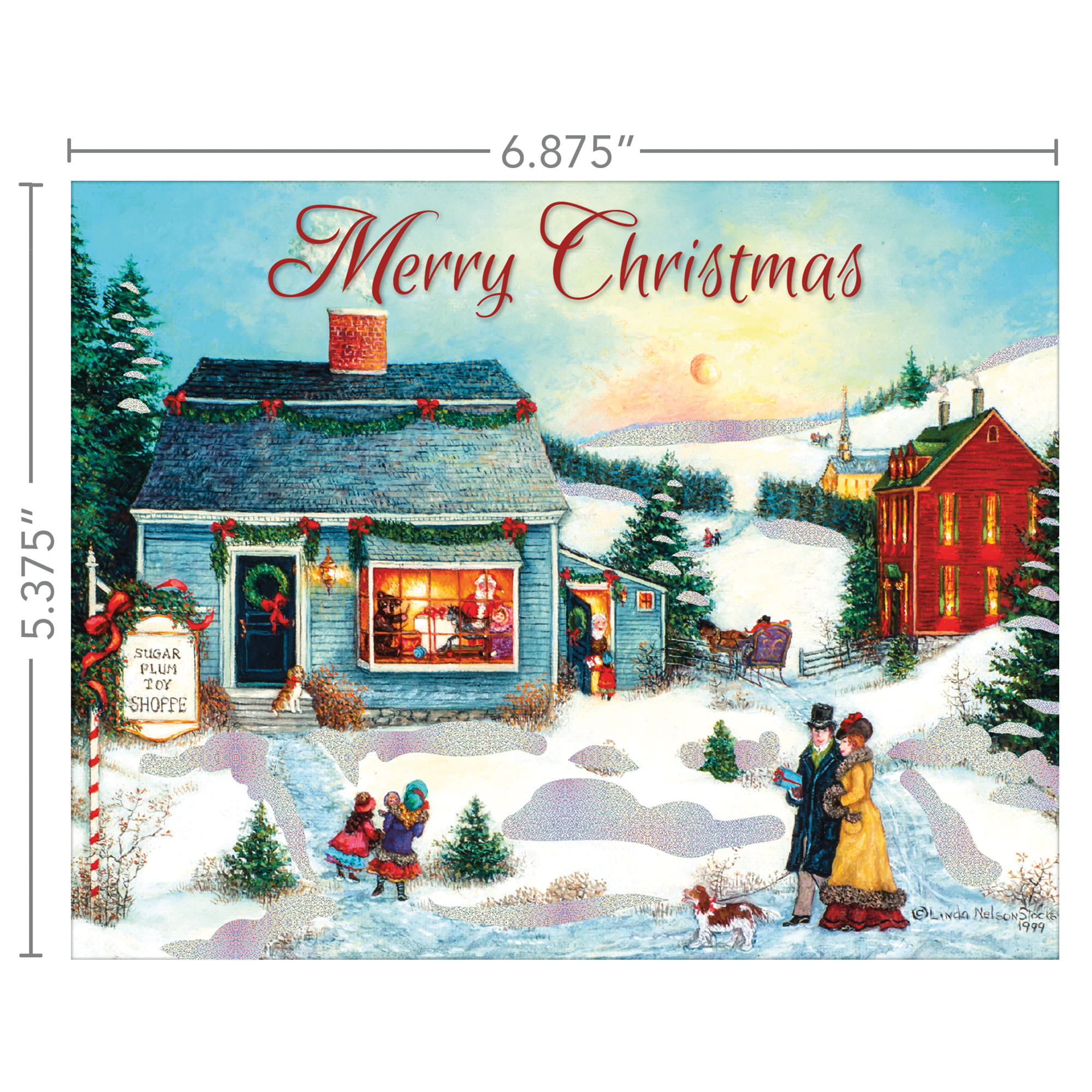 Send season's greetings to your family and friends with Sugar Plum Toy Shoppe Boxed Christmas Cards featuring artwork by Linda Nelson Stocks! Fill hearts with holiday cheer with cards that combine colorful artwork with holiday greetings inside and out. With LANG quality features like linen embossed paper stock and glitter embellishment, these are a truly special way to connect with loved ones around the holidays!Specifications