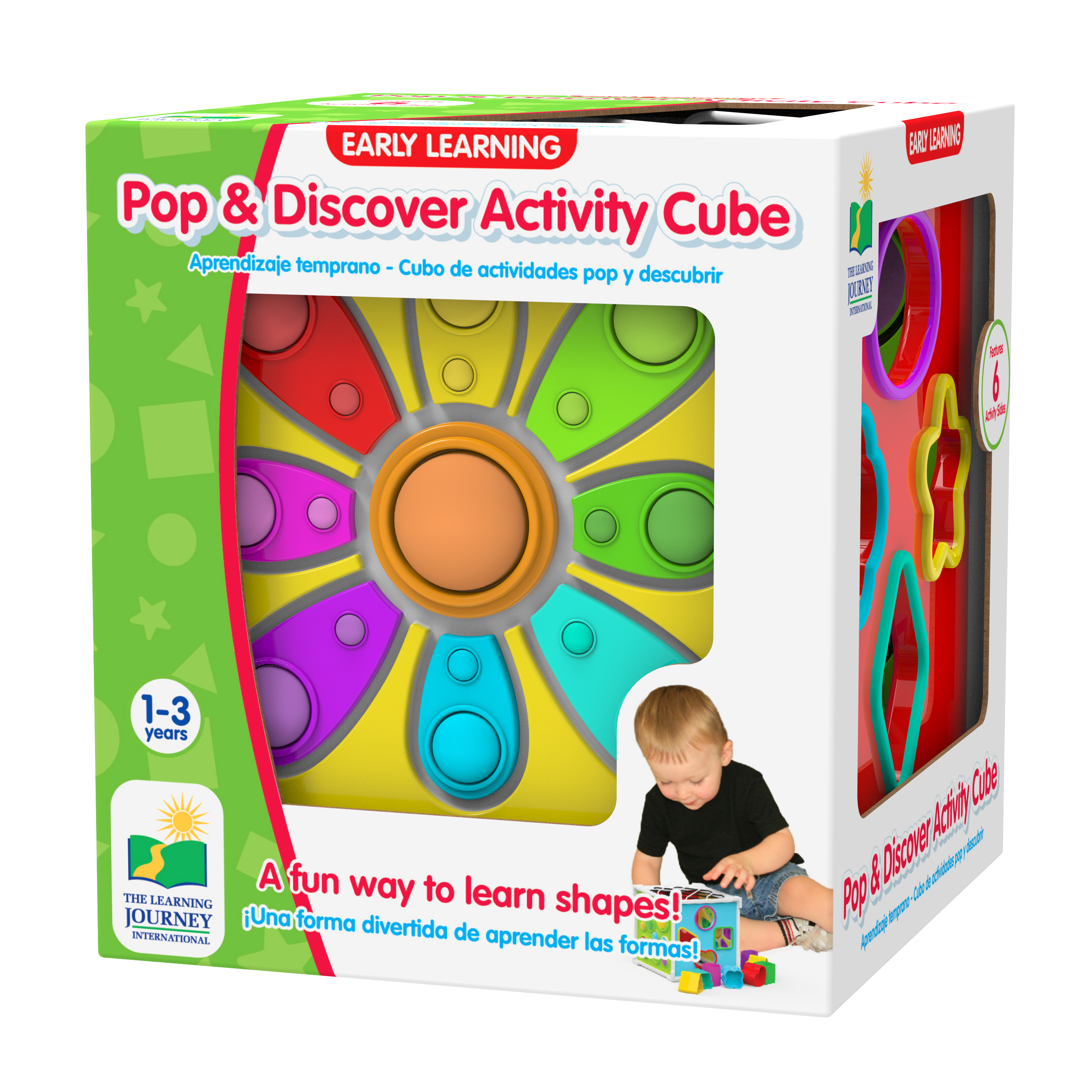 In, Out, Push, Pop, Poke, Grab This colorful and unique sensory cube provides a diverse amount of activities all in one innovative toy! Two sides feature geometric shape sorters, two sides elastic bands for tactile exploration, and two sides silicone bubble poppers for sensory delight. Pop and Discover Activity Cube is a perfect sensory adventure that babies and toddlers can take with them wherever they go.Specifications
