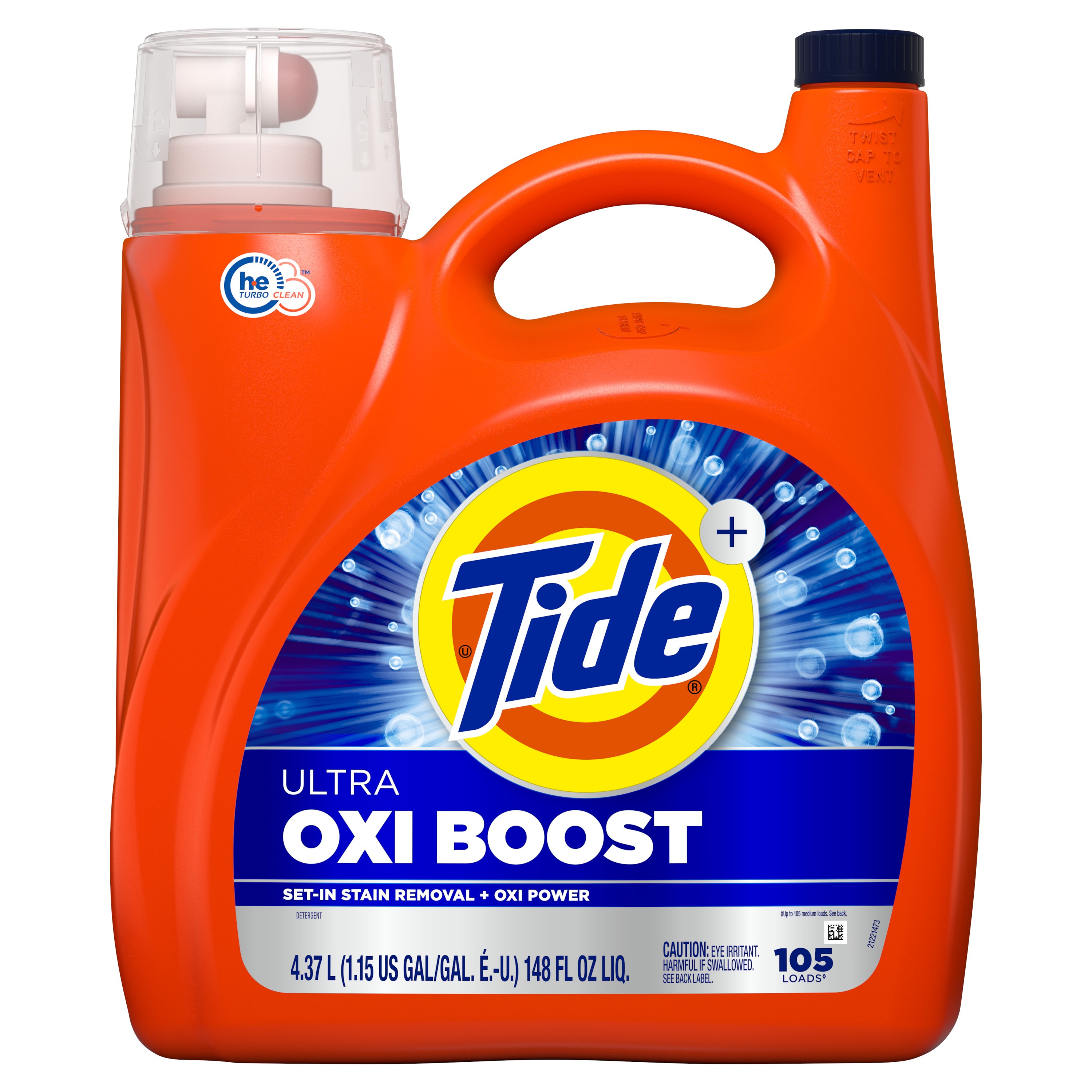 Tide Ultra Oxi Boost Liquid Laundry Detergent, 148 fl oz is designed to remove tough, set-in stains like ketchup, dirt and bbq sauce with ease - no pretreating needed. Tide Oxi Boost is packed with twice the Oxi power to deliver a clean you can see, smell and trust. Thanks to a formula that completly dissolves every time letting your clothes come out looking bright and fresh, even when washed in cold water.Specifications
