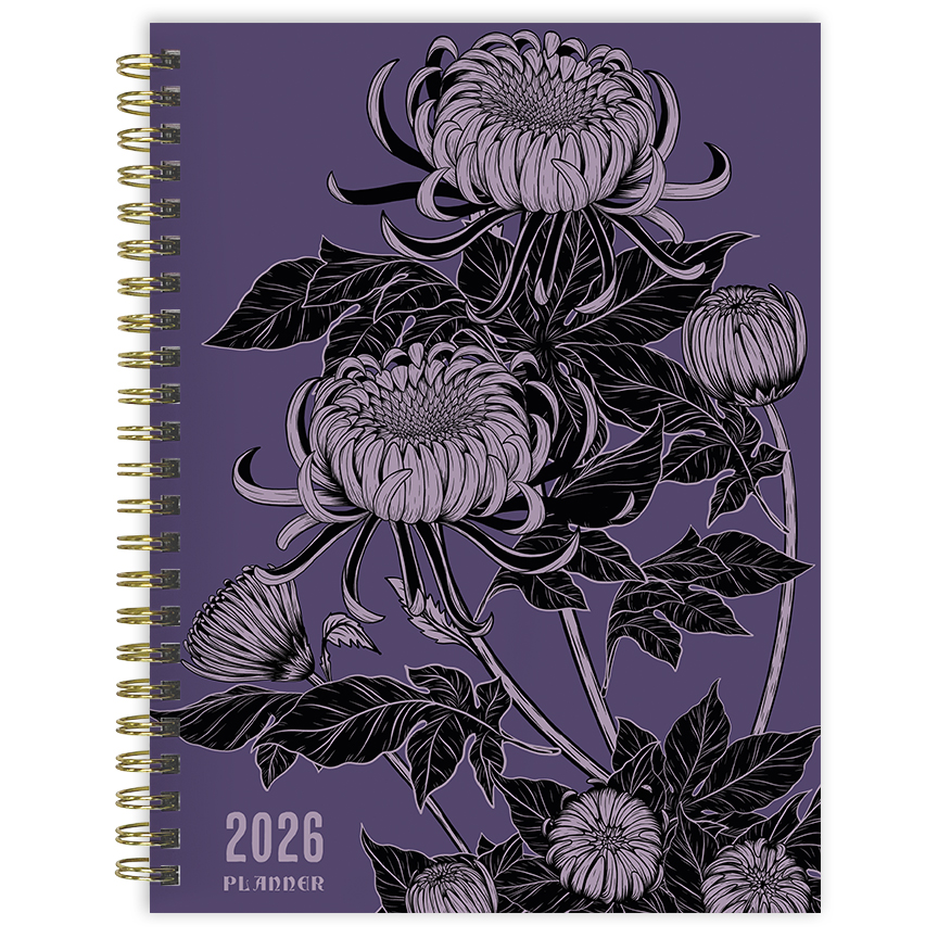Let's get witchy with our medium weekly monthly planner featuring a gothic floral cover design! Measuring 6.5" (w) x 8" (h), the all-encompassing planner boasts 2-page monthly spreads that include lined sections for notes, tasks, and goals and 2-page weekly spreads with lined daily sections to keep plans neat and organized. Plus, a dedicated weekly priorities section to help you stay focused! The interior pages are designed with a dark and moody feel, accented with faux monthly tabs for easy access to weekly planning. Enhance your daily plans with 216 color coordinating stickers to highlight special occasions and personalize your planner. Bonus lined notes pages are in the back with yearly 2026 and 2027 views in the front. Featuring a durable cover and gold wire-o binding designed to lay flat when open, this 12-month planner covers January 2026 December 2026 and includes a plastic free cover and is fully recyclable!Specifications